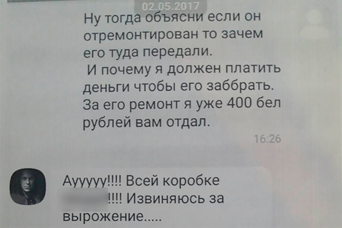 «На другой СТО обнаружили более масштабные проблемы: утверждалось, что необходимо заменить практически все детали, а это будет очень дорого, — описывает развитие событий мужчина. — Я прибыл на первую станцию, где Андрей заявил, что второй СТО нужно заплатить 150 рублей за диагностику. Андрей предложил другой вариант: сторонней СТО платить не надо, мол, пусть у них останется АКПП, а он лично привезет нам б/у коробку с гарантией сроком на 1 год и организует ее установку. У меня был выбор: либо чинить в Минске за 2400 рублей с гарантией в 6 месяцев, либо воспользоваться услугой Андрея за 1740 рублей. Я выбрал последнее. Параллельно я просил передать мне заказ-наряды, но руководство все время находило причины отказать или перенести выдачу бумаг на другой день».