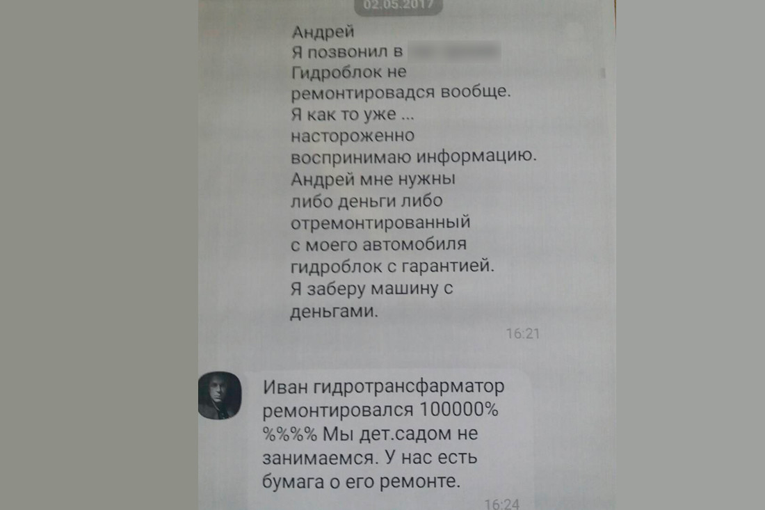 «Нужной суммы в полном объеме для единовременной выплаты у нас не было, поэтому пришлось отдавать частями в течение двух недель, — продолжает Иван. — Мне звонили каждый день. Андрей говорил, что якобы нечем выдавать сотрудникам зарплату, потому он так и спешит. В момент, когда из 1740 рублей за АКПП мы передали 1200, я уточнил, а где же тот отремонтированный гидротрансформатор? После этого начались неприятности. Выяснилось, что деталь находится на сторонней СТО. Я не поленился и приехал туда. Там сообщили, что АКПП действительно у них, 150 рублей за ее диагностику должно заплатить лицо, передавшее коробку, — то, которое указано в заявке. По словам представителей сторонней компании, гидротрансформатор никто не ремонтировал (из него льется старое масло, а для ремонта его нужно как минимум распилить, а потом запаять, наша запчасть оставалась в заводском виде). Подозреваем, мы отдали 400 рублей за ремонт, которого не было».