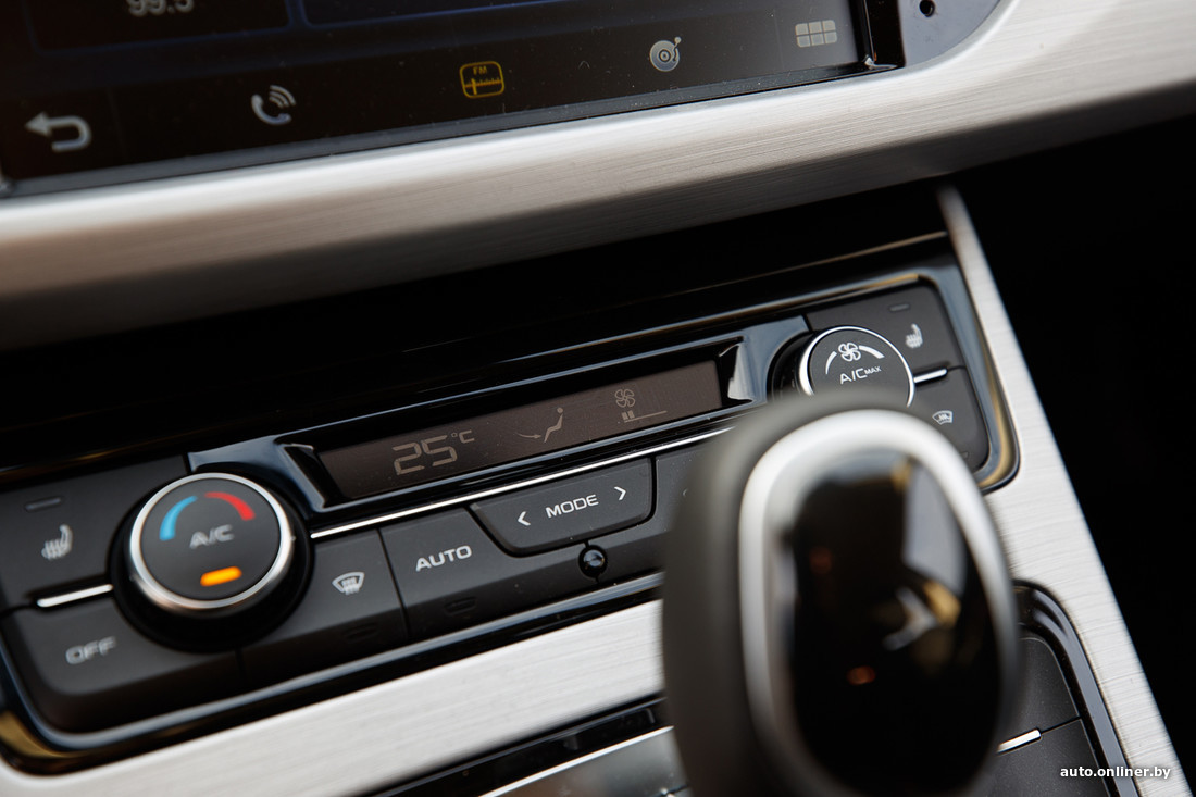 На первый взгляд в салоне тоже все хорошо. У Atlas грамотная планировка симметричной центральной консоли. По центру расположен 8-дюймовый сенсорный дисплей. Мультимедийная система, к слову, так себе. Всю переднюю панель пронзает пластиковая накладка под алюминий. И выглядит дорого, и не маркая. Отличное решение! Этажом выше — дубовый пластик, выглядящий, к слову, благородно. Ощущения дешевизны в салоне нет, как нет и откровенных огрехов в эргономике. Сидишь по-кроссоверному высоко. Ничем не хуже, чем в том же Sportage. Тучным водителям может не хватить места по ширине.