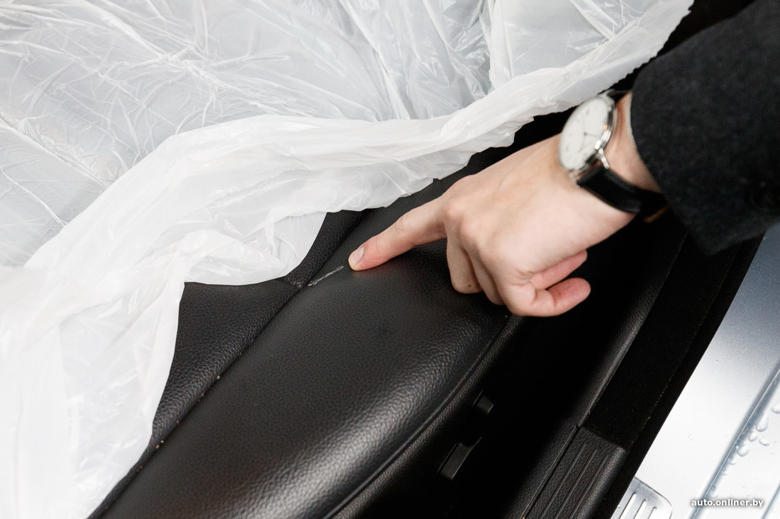 За время беседы специалисты уже подготовили отчет о всех найденных неисправностях и нюансах. Заметили, что крышка багажника и задний бампер были перекрашены — по словам Дмитрия, это последствия столкновения на парковке. На переднем бампере, правом крыле и двери заметны сколы и царапины (продавец готов «скинуть» на перекраску). Лобовое стекло неоригинальное, было заменено для прохождения техосмотра. В салоне обнаружили трещину экокожи на водительском сиденье, на кнопках магнитолы — след от капли жидкости ароматизатора.