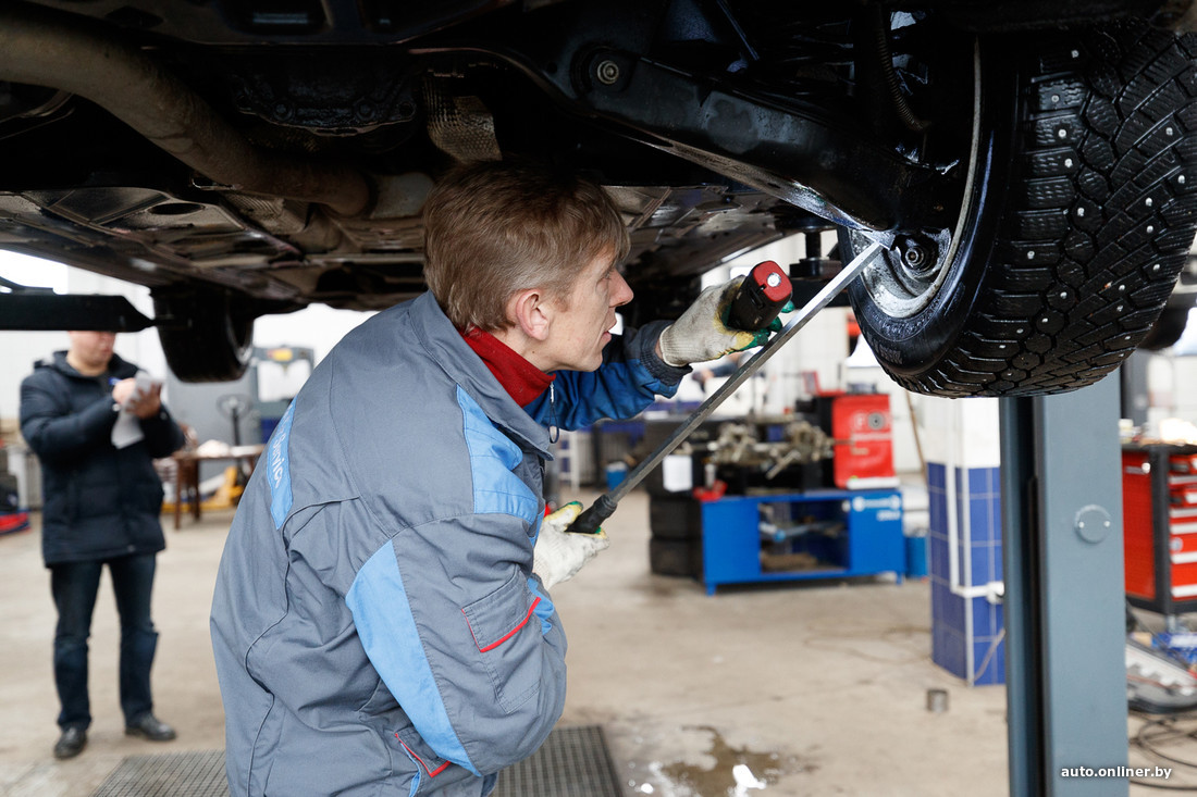 Отправляем авто на подъемник. «Есть следы течи моторного масла, — говорят мастера. — Тормозные колодки изношены, их следует заменить с дисками. Также замене подлежит передний правый рычаг наклона».