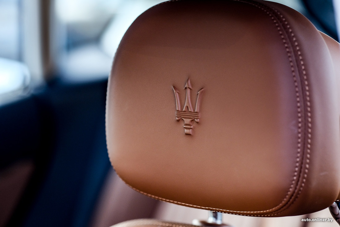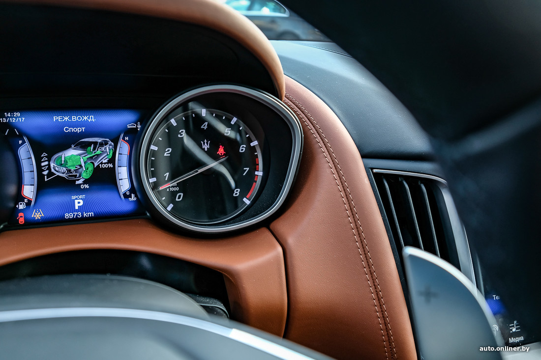 Двери в машине отличаются отсутствием оконных рамок. У какого еще кроссовера вы такое видели? Стекла двойные, с толстым слоем шумопоглощающего материала. Доводчиков нет, но двери закрываются с благородным хлопком, не оставляя после себя никаких дребезжащих звуков. Как и положено автомобилю за 100 с лишним тысяч евро, в Maserati имеется целый склад кожи, алюминия, дерева, алькантары и других дорогих материалов. Везде, где это уместно, разместили логотип-трезубец. На вершине центральной консоли — стильные аналоговые часы.
