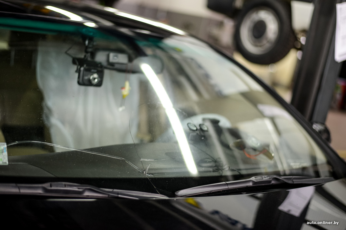 Специалисты СТО сразу обратили внимание на трещину на лобовом стекле. Виталий говорит, что новое стекло уже куплено, а этот след оставила прилетевшая с многоэтажного дома тарелка, когда машина была оставлена на гостевой парковке. Также заметны сколы и царапины на переднем бампере, проводились кузовные работы на переднем левом крыле (зацепил грузовик в узком проезде). Трещина на заднем бампере свидетельствует о легком столкновении со столбом. Не работает парктроник.