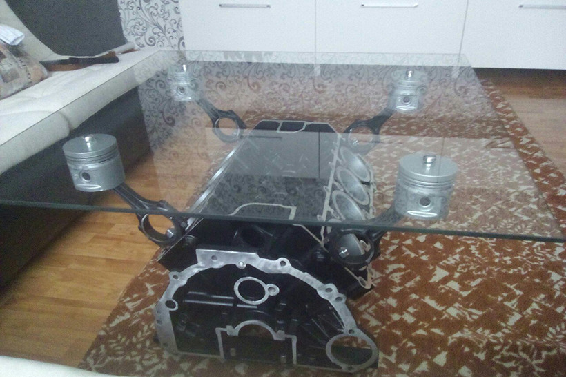«Вспомнил, что у знакомого валялся без дела двигатель от старого советского грузовика, — рассказывает мужчина. — Вскоре я уже работал над очисткой замасленной детали. Как оказалось, очистить до блеска старый двигатель — дело непростое. В ход пошли средства для чистки плит, очистители, окислители… Лишь спустя недели усердной работы появился тот самый долгожданный хромированный блеск. После того как привел в порядок двигатель, Сергей отыскал стекло, недостающие детали и соорудил автостол».