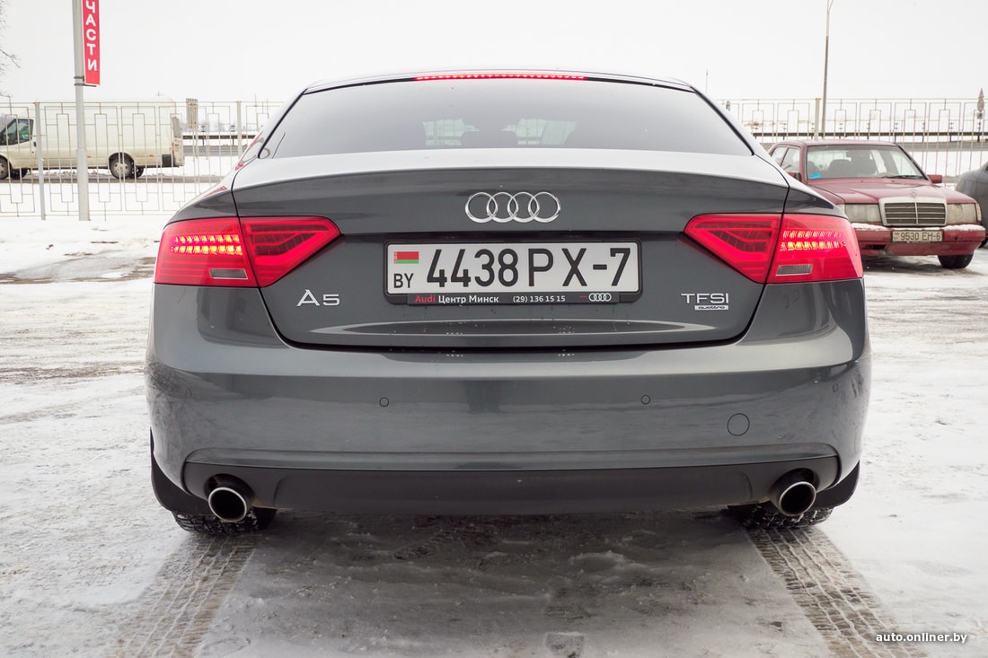 «Это серый Audi A5 2013 г. в. с двигателем объемом 2.0, TFSI, — говорится в объявлении. — Полный привод (Quattro), 6-ступенчатая механическая коробка передач. Мощность — 225 л. с. Пробег — 92 тысячи километров. Я второй владелец. Первый покупал автомобиль в декабре 2013 года у официального дилера Audi в Минске. В моем распоряжении — с декабря 2015-го (продавался также через официального дилера). Хорошая сбалансированная комплектация: кондиционер, легкосплавные диски, ксенон, парктроник, подогрев сидений, система контроля стабилизации, громкая связь».
