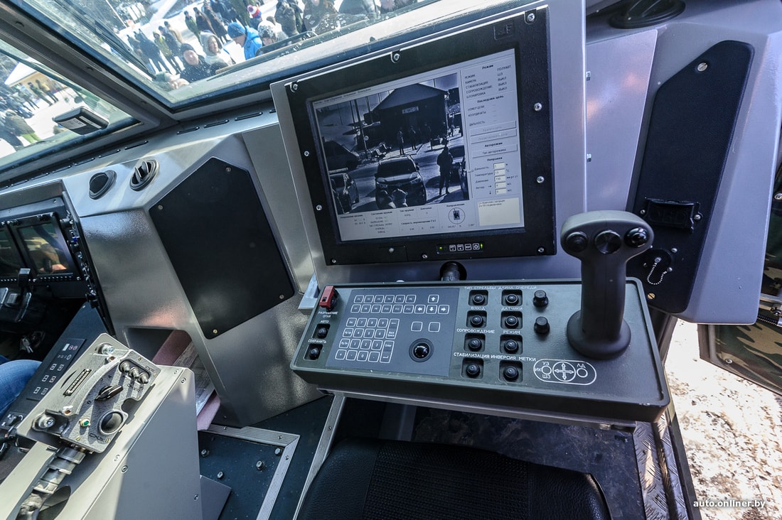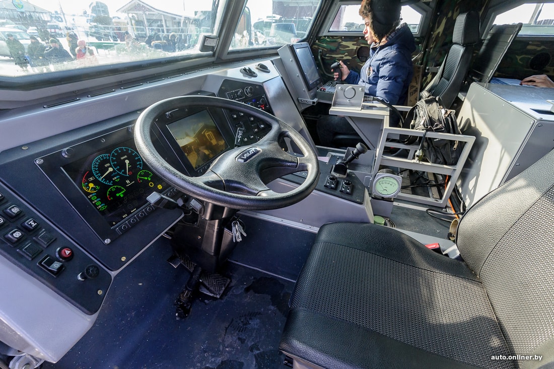 На крыше — пулемет (калибр 12,7 мм), который управляется изнутри «Волата». Там, прямо перед стандартным пассажирским сиденьем, разместился планшет с клавиатурой и джойстиком — органами управления пулеметом. Как видно на фотографиях, камера с зумом функционирует (ночью используется тепловизор), а дуло двигается. Нажимаешь кнопку — открываешь огонь. Работу пулемета проверять не стали, так как в прицеле — парковка «гражданских».