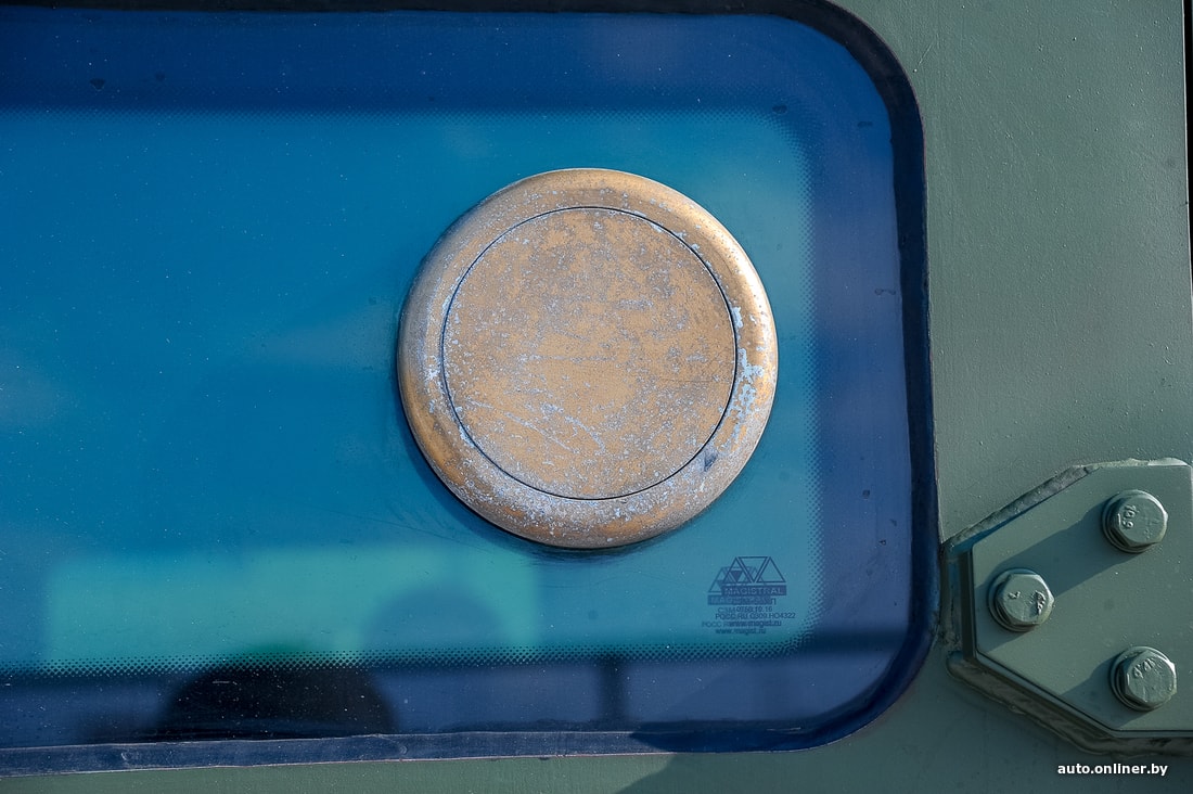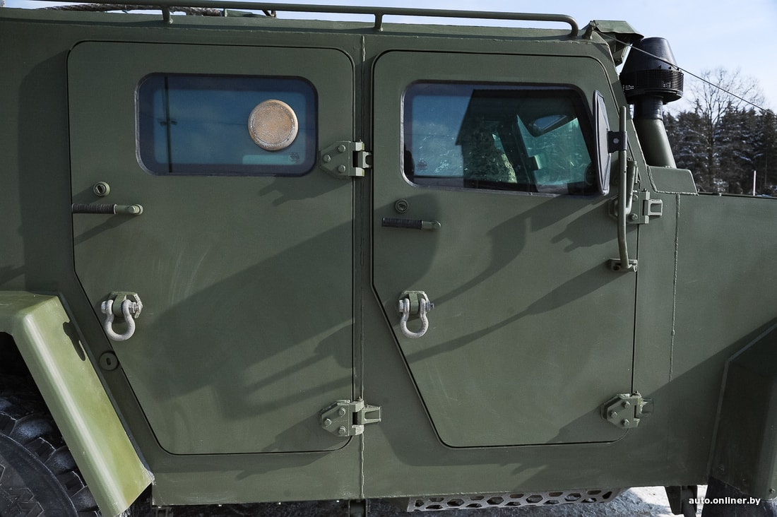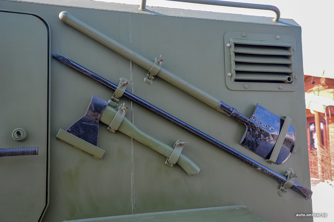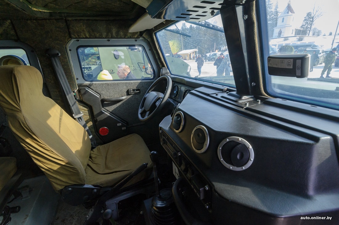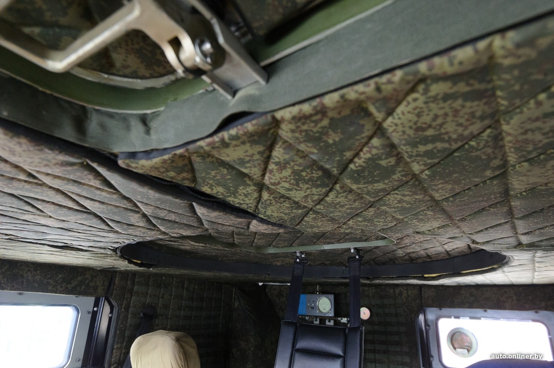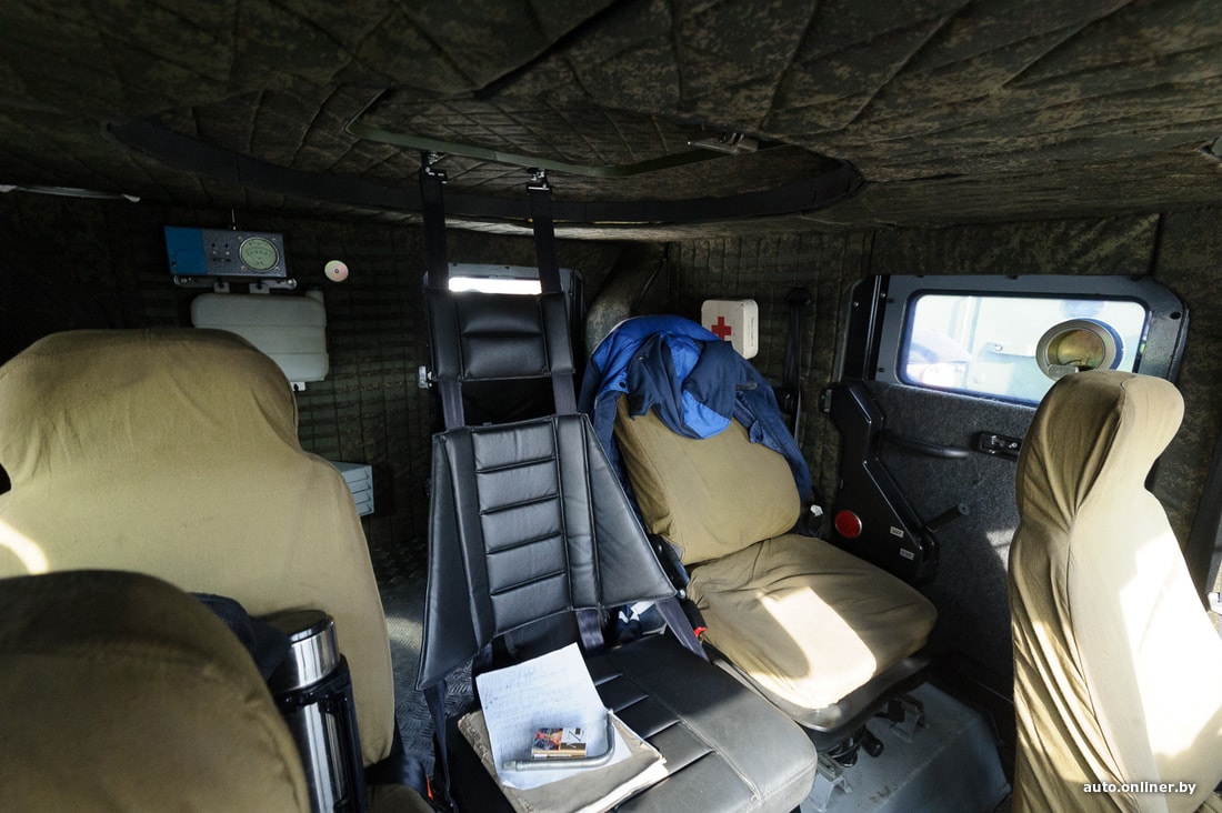 На нашем образце из дополнительного оборудования — только стандартный радиовывод, лебедка с креплениями для троса и отопитель. Судя по всему, машина не представляет собой какой-либо прорыв в индустрии, более важными стали характеристики защиты и простота производства. Внутри — радиоточка и место для экипажа. Всего помещается пять человек. Перевозка экипажа — главная задача для представленной модели. Вместо сидений можно установить, например, столы для штабной работы или спецоборудование для радиоэлектронной борьбы. Корпус — бронированный, защищает по периметру от пули калибра 7,62 мм (АКМ) на дистанции 10 метров, от подрыва под днищем ручной гранаты типа Ф-1 или РГО. Стекла также пуленепробиваемые. Шины тоже непростые — с подкачкой. А в случае если резина окажется окончательно порвана, помогут бронированные вставки — благодаря им бронемобиль проедет до 50 км на полностью пробитых колесах.
