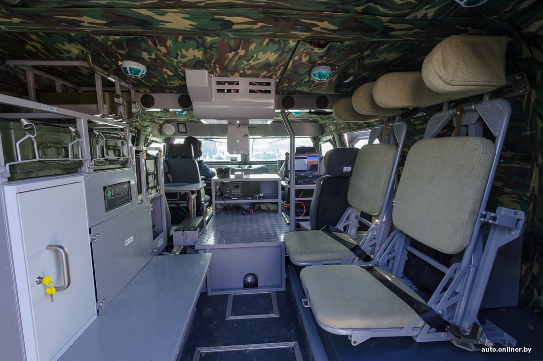 Перед нами — версия броневика, созданная совместно с предприятием «Агат». У кормы — антенная мачта. Система передачи данных не нуждается в сотовом операторе. По сути, она и создает для себя сотовую связь поколения 4G. Несколько больших ящиков со столиком — ее оборудование. Питание — от генератора во время работы двигателя и от АКБ, если мотор заглушен. При необходимости внутри можно установить дополнительные сиденья. В салоне поместится до 10 бойцов.