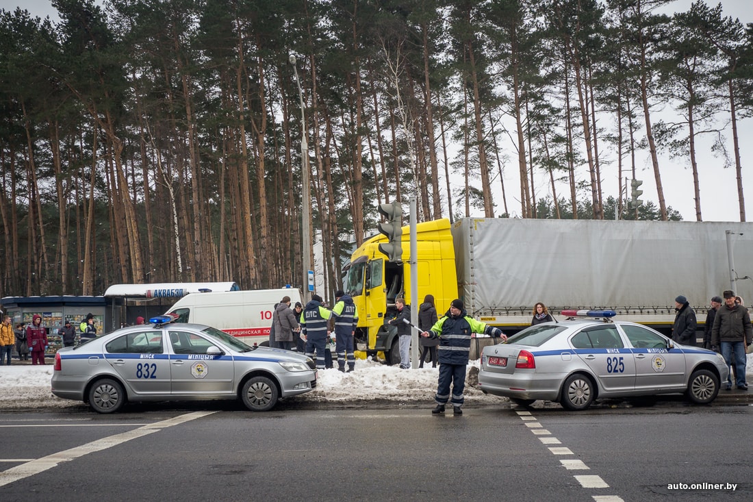Сегодня днем на границе Минска, в районе пересечения МКАД и трассы М3 (Минск — Витебск), случилось серьезное ДТП. По предварительной информации, фура выехала на регулируемый пешеходный переход, по которому в тот момент шли люди.