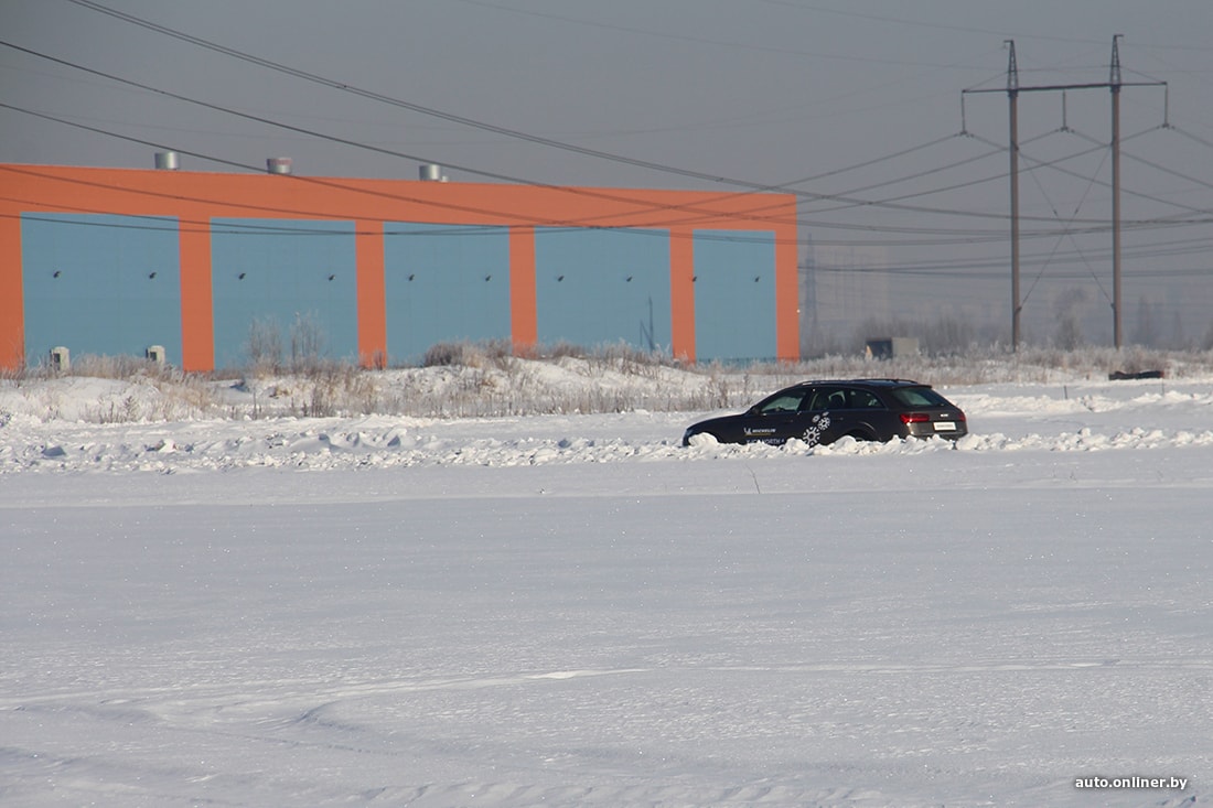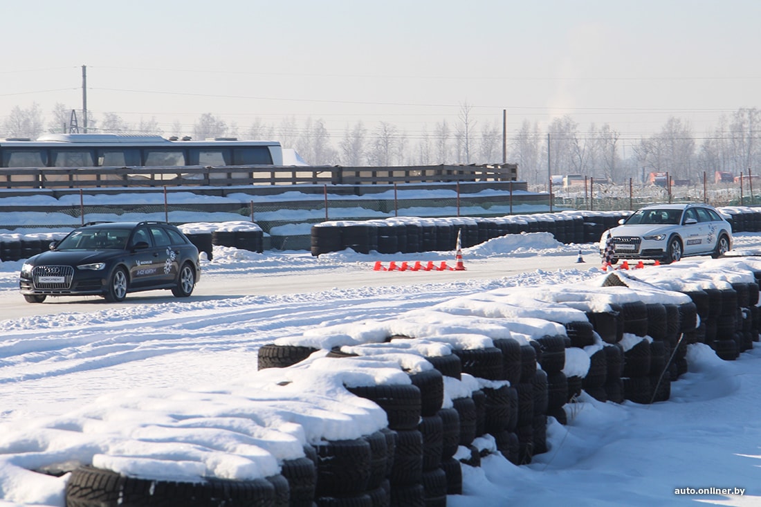 Нам предложили испытать шипованные шины разных производителей на идентичных Audi A6 Allroad. Необычный тест — проезд по асфальту на шипах, чтобы услышать разницу в шуме. Признаться, я никогда не отличался музыкальным слухом, да и различия по децибелам в официальных показаниях совсем незначительные. Потому по моему субъективному восприятию в этом упражнении не оказалось победителей.