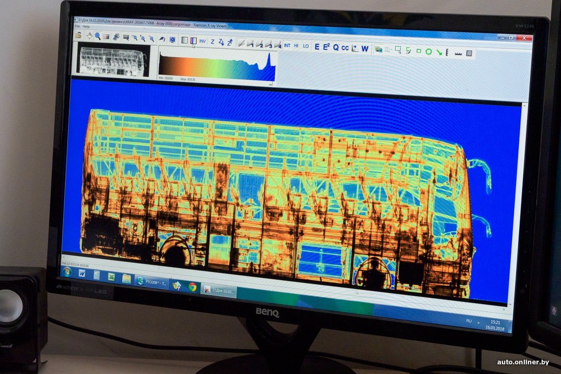 Кроме маленького рентгена для чемоданов, в пункте пропуска имеется комплекс для досмотра автомобилей. Он позволяет «просветить» даже фуру. И точно так же сотрудник таможни видит перед собой на экране картинку. Вот только как он на ней может что-то определить?