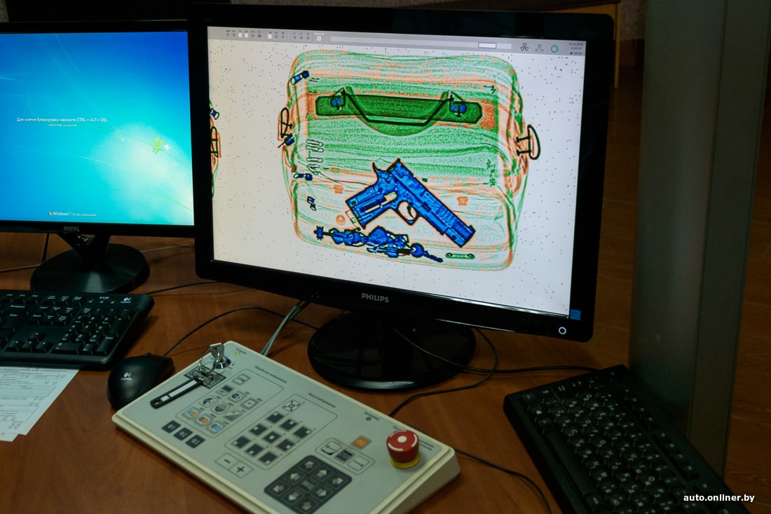 Нам показали, как это работает. В сумку спрятали муляж пистолета. Рентген выдает настолько четкую картинку, что с первого взгляда становится понятно, что в сумке находится оружие. Видно даже, как именно оно расположено.