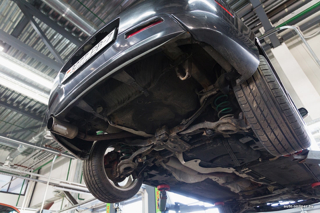 Во время осмотра на СТО специалисты обнаружили люфт заднего ступичного подшипника, течь бачка гидроусилителя, запотевание сальника полуоси. На левой полуоси неверно установлены хомуты пыльника. Кроме того, видоизменена система выхлопа, занижены пружины. Компьютерная диагностика выявила ошибку лямбда-зонда (скорее всего, появилась после перепрошивки), а также ошибку подушки безопасности (не удалось определить). На ЛКП заметны сколы в области арок.