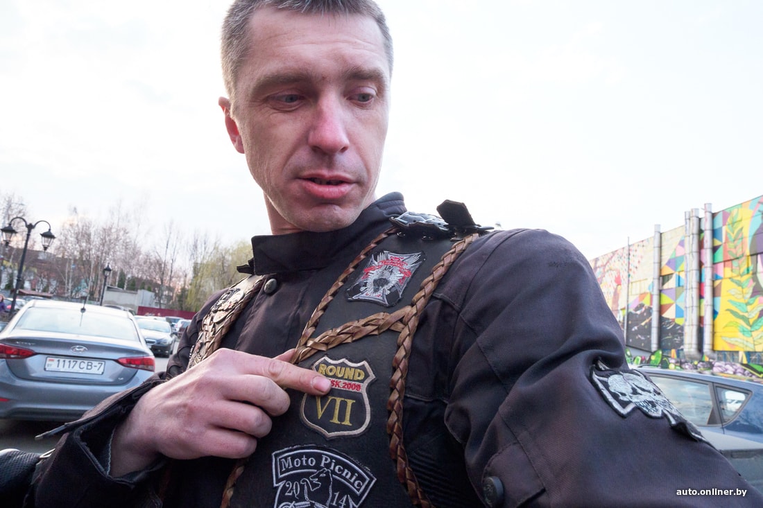 — Для любого уважающего себя байкера жилет — необходимый атрибут, это своеобразный дорожный дневник, — рассказывает Александр. — И это не просто так. За каждый значок могут спросить: а ты был там? Вот у меня тут со слета «Железных братьев» на Минском море в 2009-м. Эта нашивка появилась после поездки в Сморгонь. Тут Барановичи... На почетном месте «Завiруха-2015».
