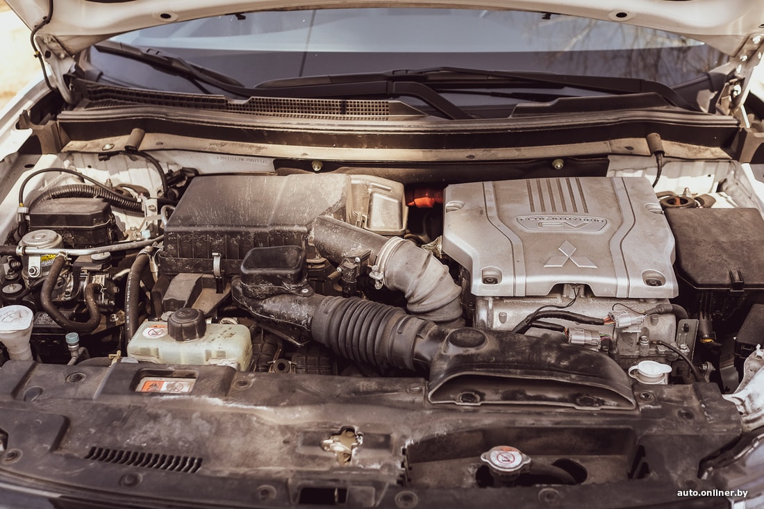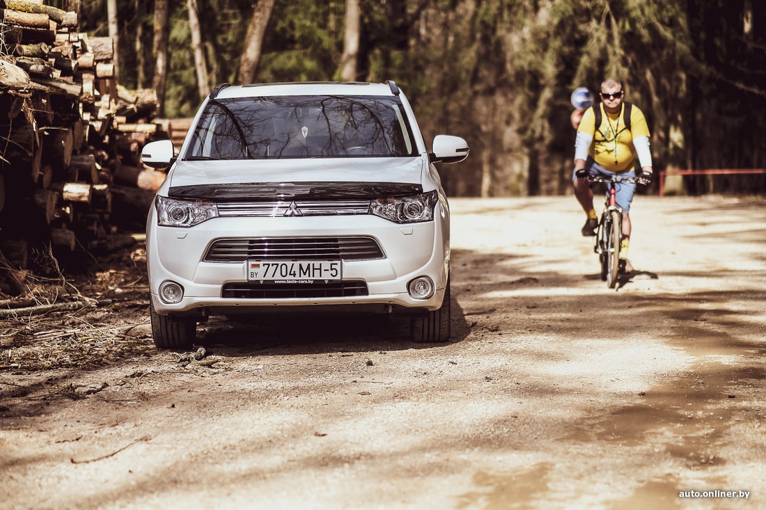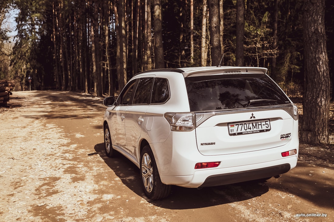 Под кузовом этой машины скрываются два электромотора, каждый по 82 л. с., бензиновый 2-литровый мотор от базового Outlander (дефорсирован до 121 л. с.), литий-ионная батарея смехотворной емкостью 12 кВт·ч, 40-литровый бензобак. Коробки передач нет, зато есть 1-ступенчатый редуктор с передаточным отношением 0,95. Он позволяет ДВС передавать крутящий момент на переднюю ось. Задняя получает порцию «ньютон-метров» только от электромотора.
