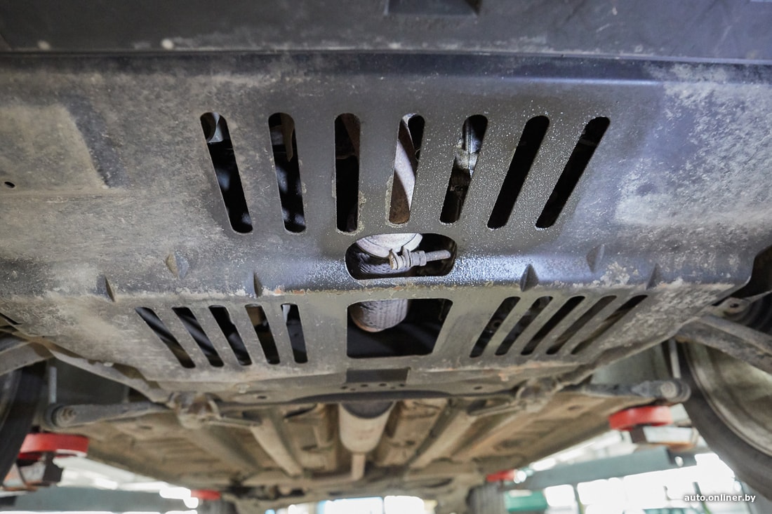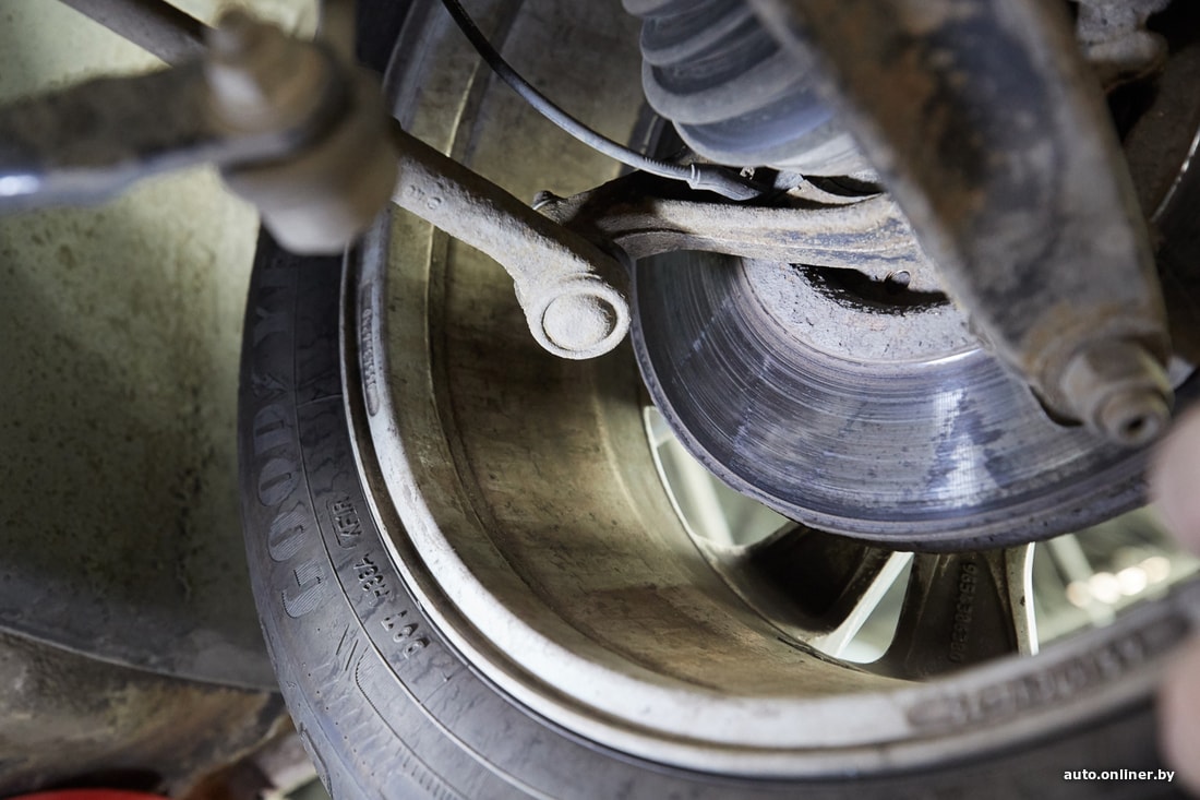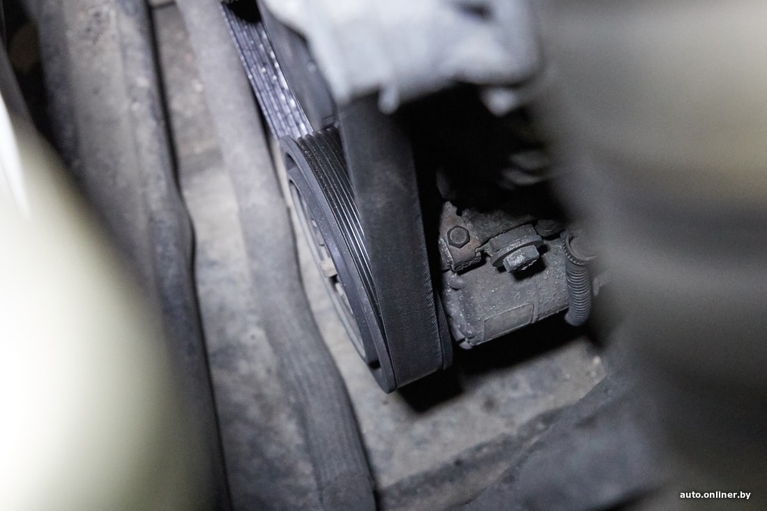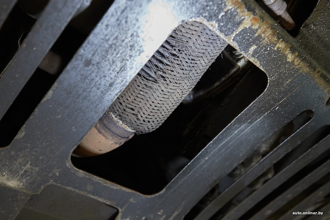 Возвращаемся к результатам диагностики. Механики заметили трещину на поликлиновом ремне, люфт левого рулевого наконечника и повреждение гофры глушителя, что может приводить к вибрации, например, во время заводки. Кроме того, в задних тормозных суппортах мастера посоветовали провести профилактику механизма стояночного тормоза.