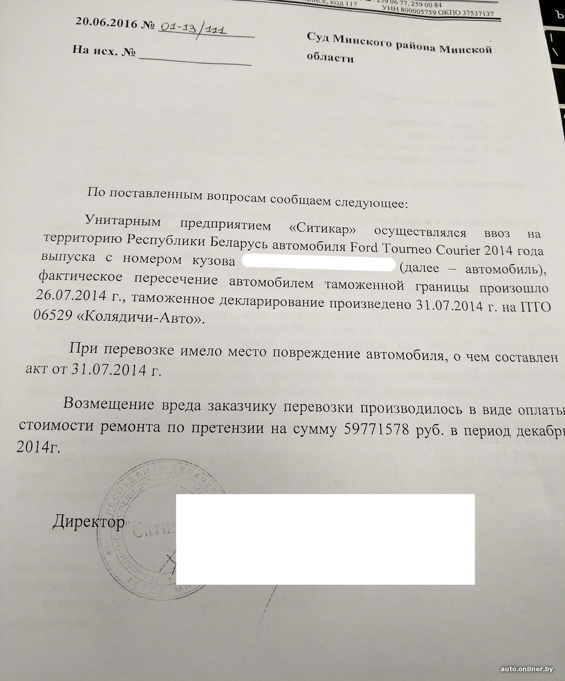 Максим с адвокатом пытались узнать подробности повреждения автомобиля у перевозчика, который осуществлял доставку данного Ford в Минск. В предоставлении информации было отказано, т. к. это является коммерческой тайной. Но отказать суду перевозчик не имел права и предоставил все данные о той погоне. Оказалось, что поврежденной была только одна машина на автовозе. VIN-номера совпадают, и теперь сомнений нет — именно этот Ford Tourneo Courier находился на автовозе, когда в него стреляли.
