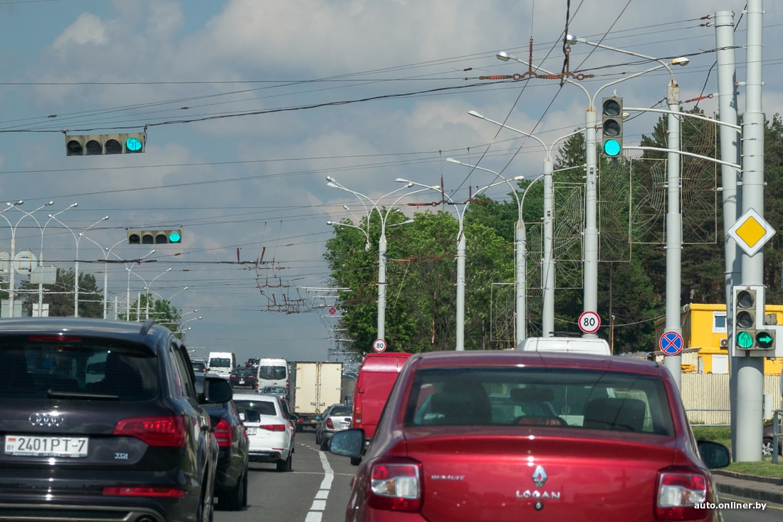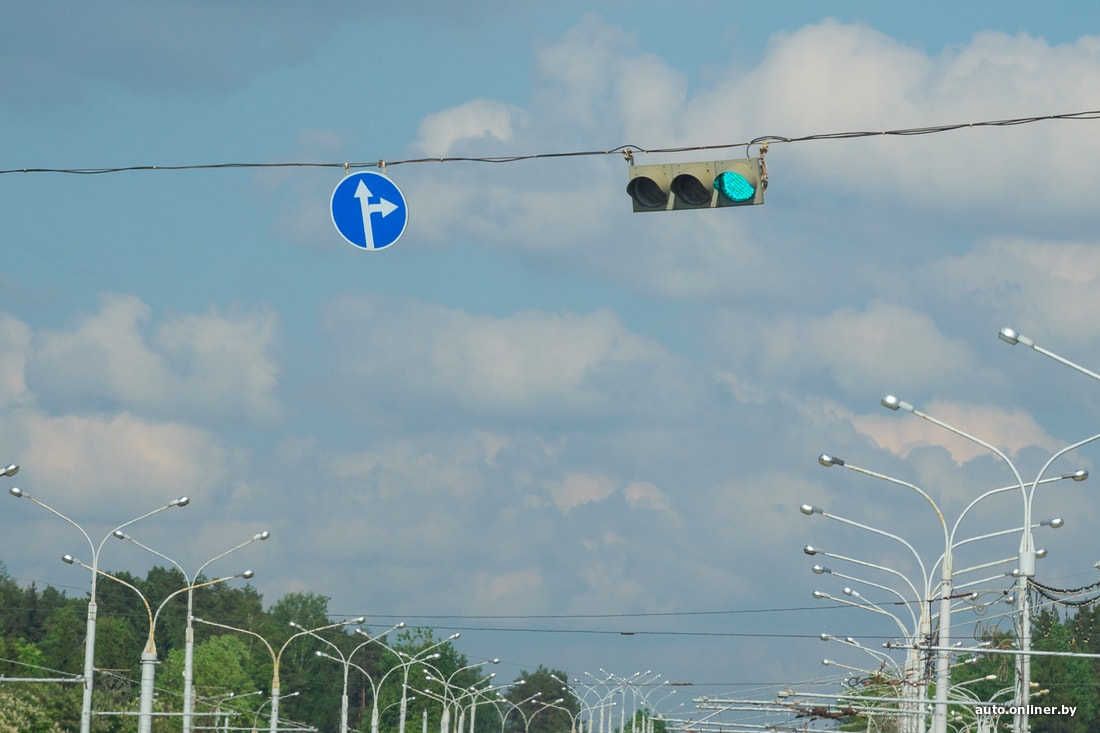 В данном случае имеем дело как раз с классическим для Беларуси размещением светофоров (загибаем пальцы: это уже второй вариант для проспекта) — на столбах справа и слева от дороги. Стоек нет, и в такой ситуации реально оказаться в положении, когда сигналы будут не видны.