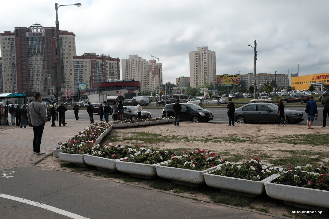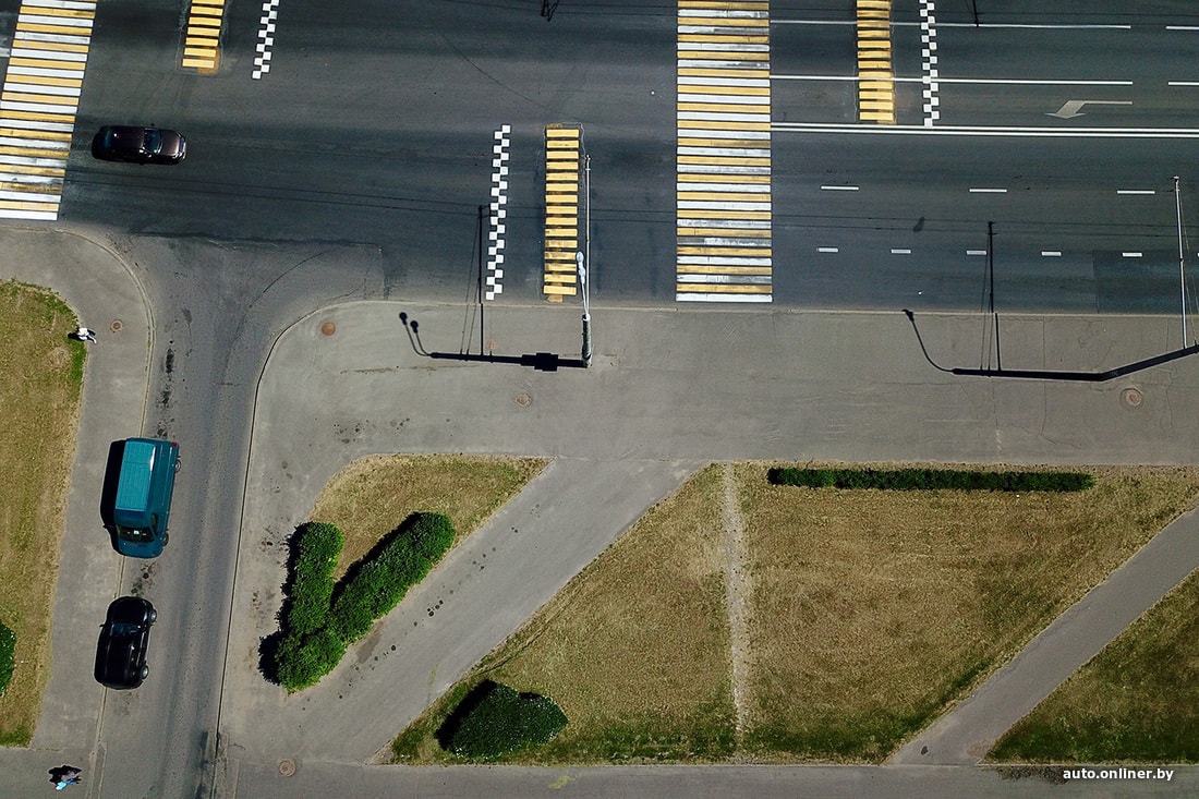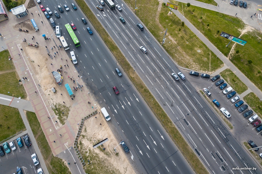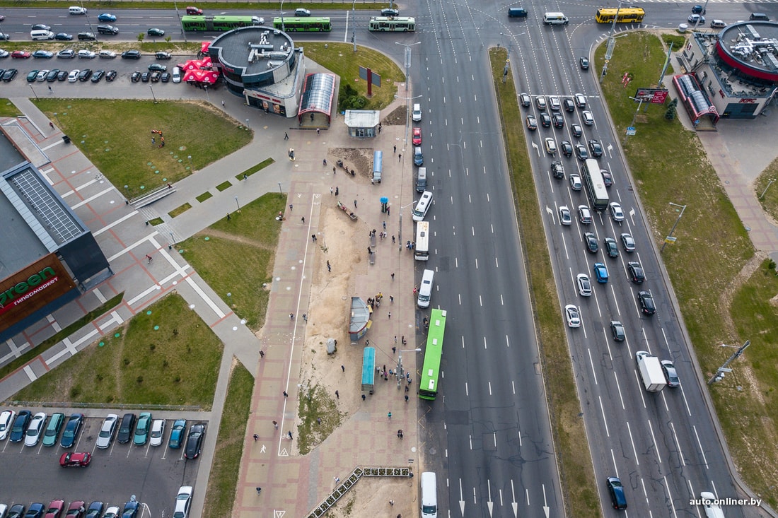 Понятно, что работает это далеко не всегда. Например, на ул. Притыцкого (возле ТЦ Green City) кто-то поставил цветочницы возле остановки общественного транспорта. Ощущение, что сделано это для защиты газона от посягательств пешеходов. Но судя по виду сверху, помогло не очень.