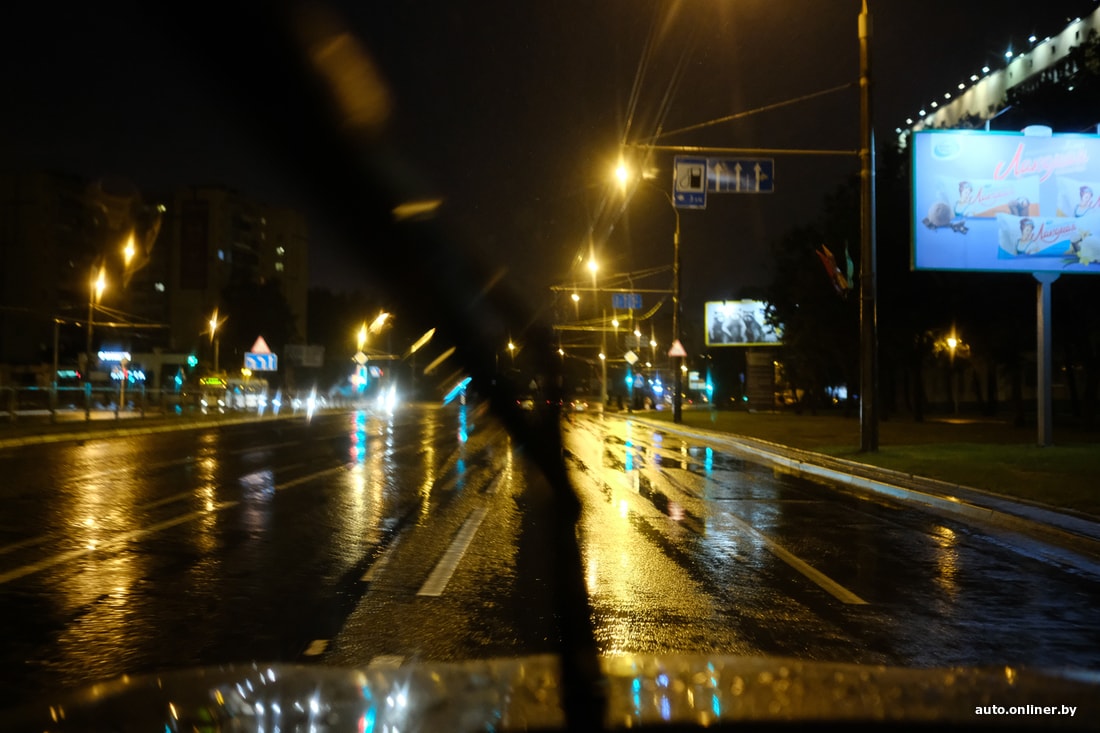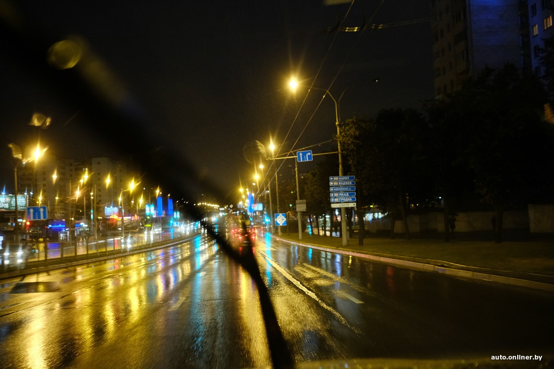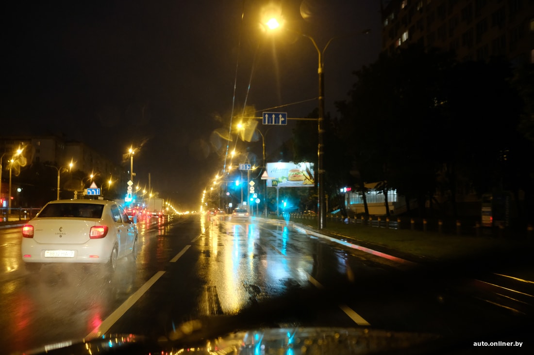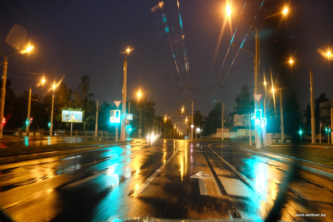 Ради чистоты эксперимента мы решили сделать фото разных участков минских улиц в нормальных условиях (днем, когда было сухо) и ночью во время дождя. Только объективной картинки (такой, которая видна невооруженным глазом) не получилось.
