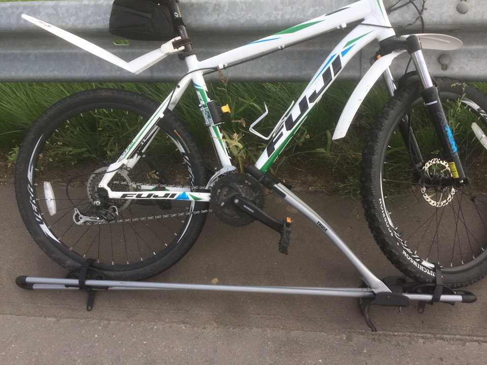 Мужчина рассказал о неприятности: «Однажды вечером ехал по неоживленной трассе с максимально допустимой скоростью, разрешенной на ней, — 120 км/ч. Вдруг раздался какой-то хруст. Посмотрел в зеркало заднего вида и увидел, как на дорогу приземляется весь мой груз, установленный на багажник. К счастью, позади меня никто не ехал. Результат жесткого приземления: трещина в боксе, рассыпанный по бетонке багажник Vesta, царапины на ручке и сиденье велосипеда Fuji, деформированное велокрепление Thule. Вызвал ГАИ, оформили ДТП, дали штраф за то, что не проверил багаж перед выездом. На руки получил справку о ДТП».