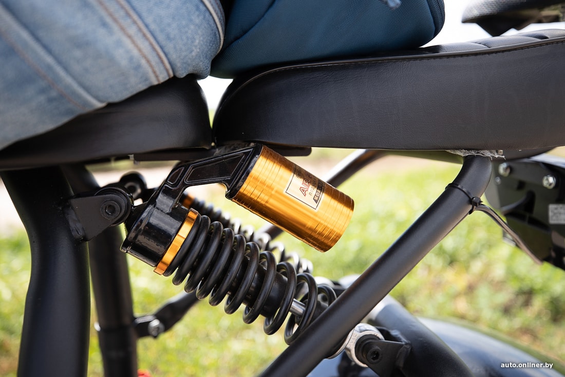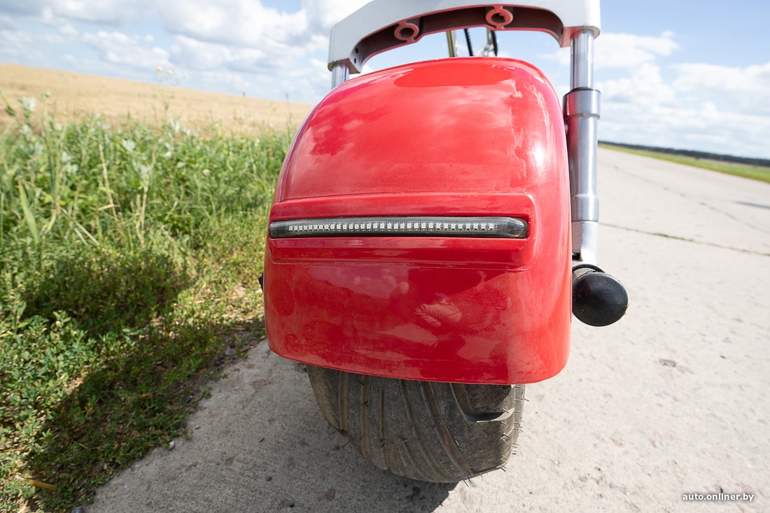 Начнем с дорогой модели. Выглядит скутер очень эффектно. Массивная вилка, широченные колеса, яркие красные крылья… Спереди обращает на себя внимание круглая фара, на корпусе которой разместили двух драконов. Имеются поворотники (спереди и сзади). На модели, которую мы взяли на тест, отсутствуют зеркала заднего вида. На самом деле они есть в комплекте — просто не успели закрепить. Скутер прибывает в Беларусь в разобранном виде, но компания-продавец привозит модель клиенту уже собранной. Доставка по РБ, к слову, бесплатна.
