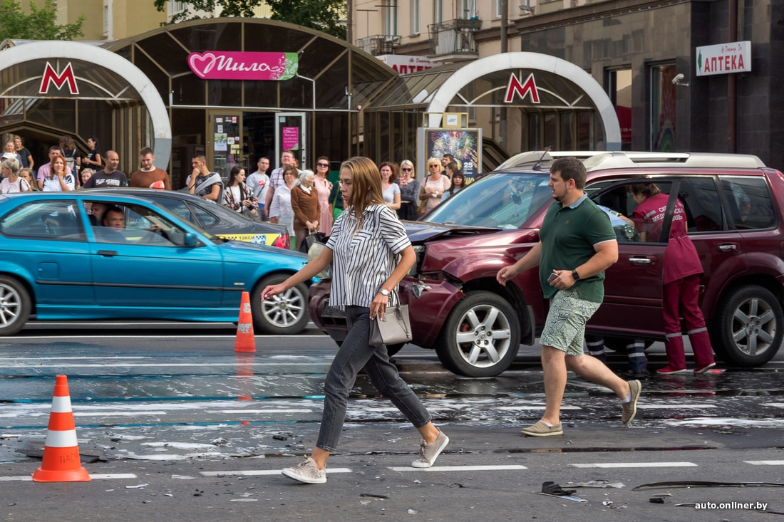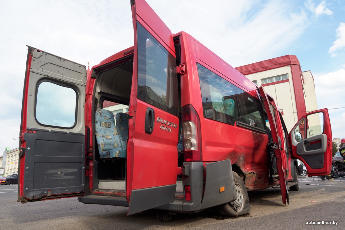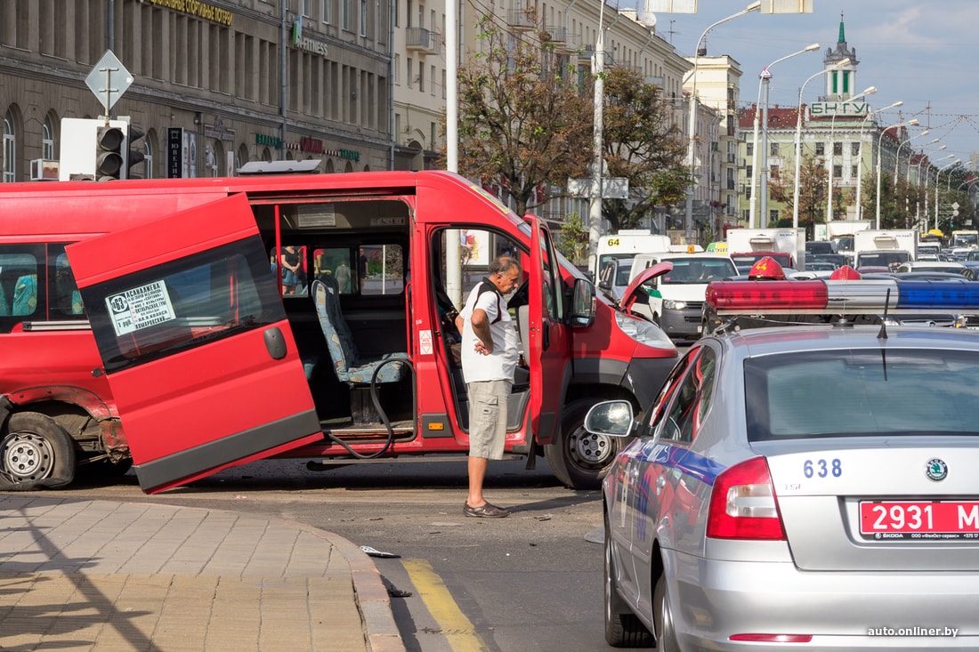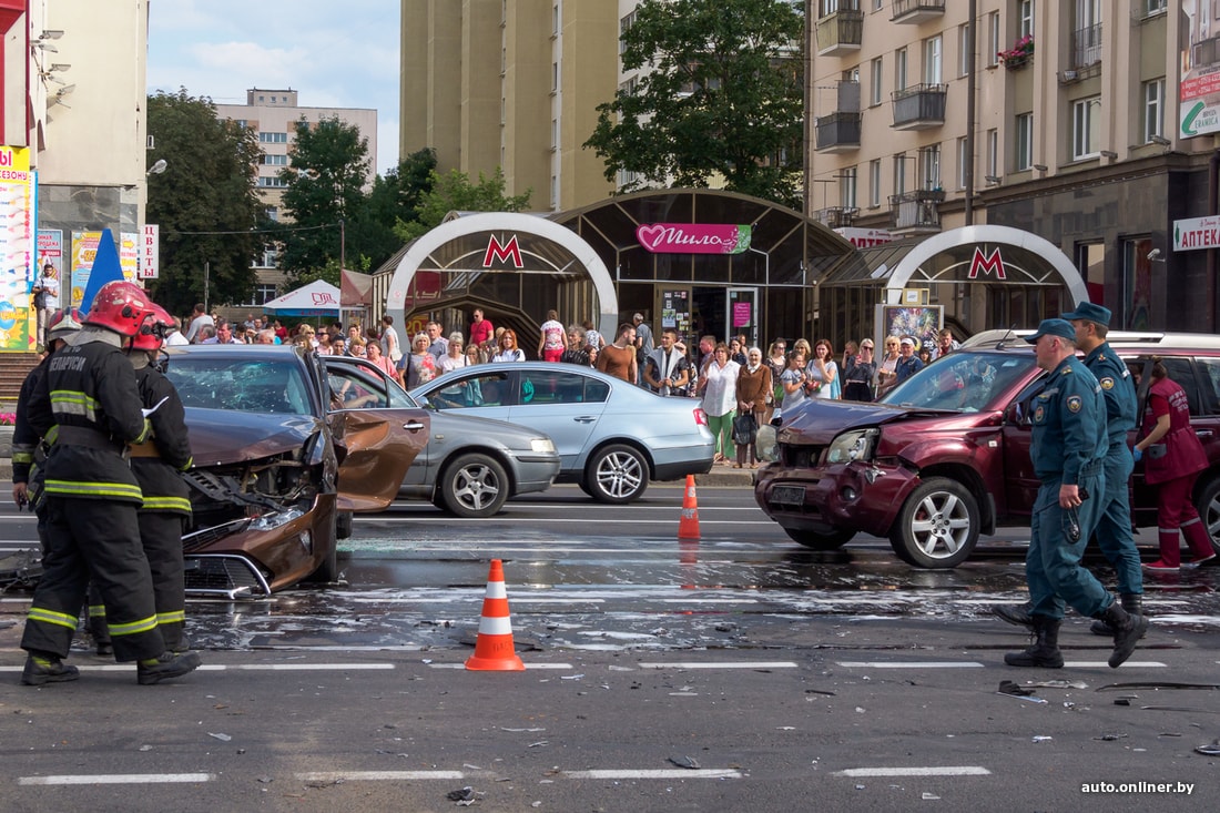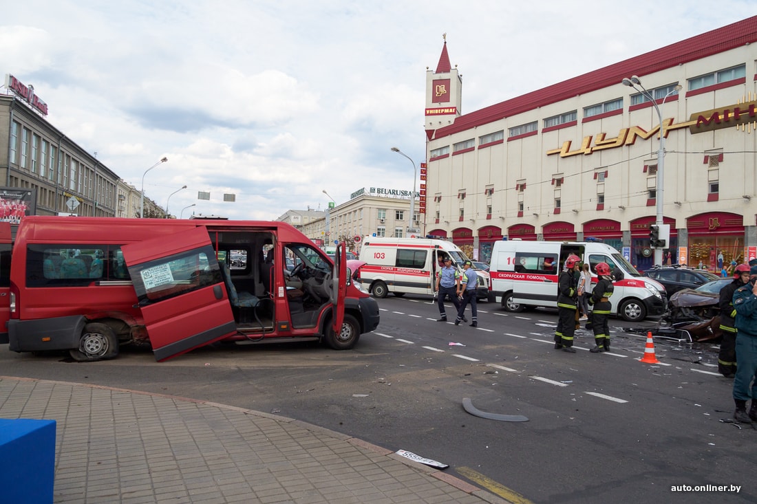 Присутствующий на месте происшествия корреспондент Onliner.by так описывает картину: «Все произошло перед поворотом с проспекта на проезд к ул. Коласа (тот, что напротив спорткомплекса „Олимп“). Седан Toyota Camry и кроссовер Nissan X-Trail стоят так, будто первый подрезал второй. У первой машины помята боковая часть, у второй — передняя. Маршрутка Fiat (маршрут №63) стоит чуть поодаль, на самом перекрестке с проездом, у нее подбито заднее правое колесо. Как случилась череда столкновений, сказать сложно».