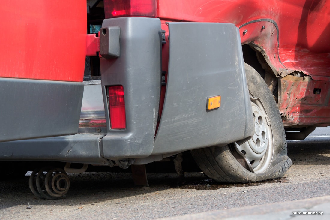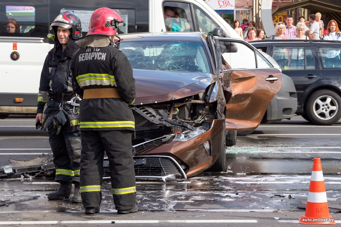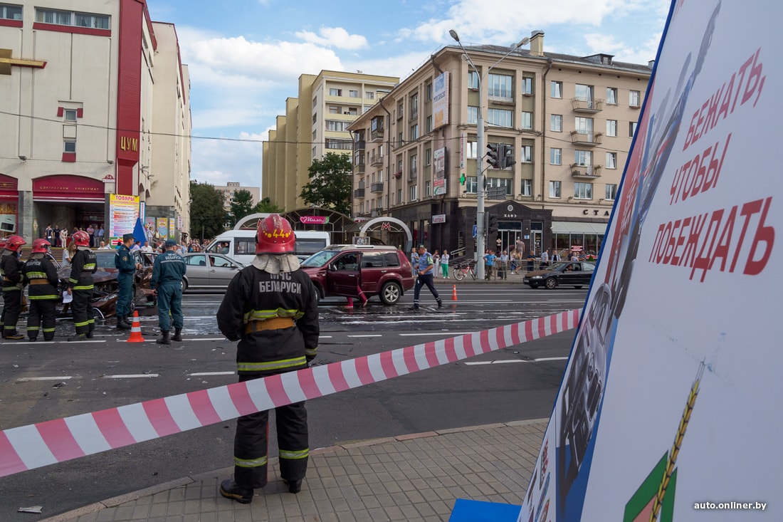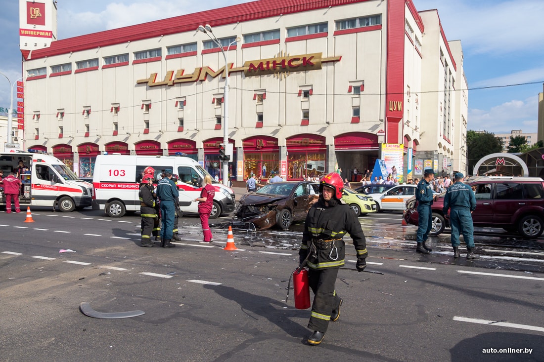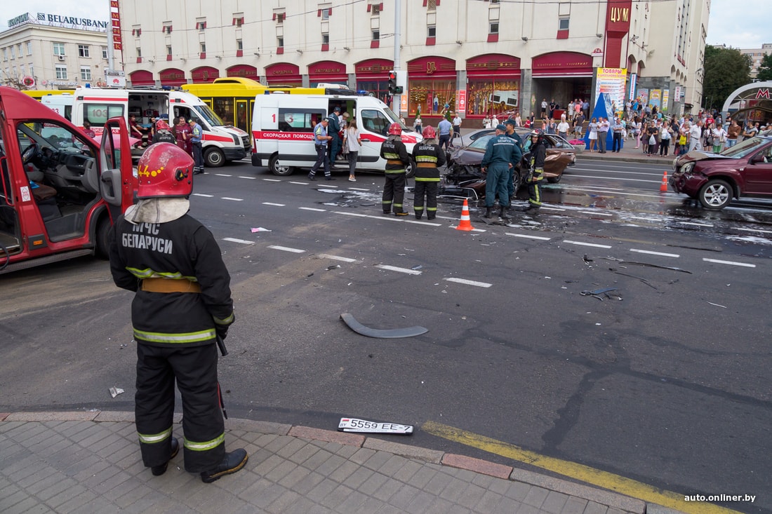 Присутствующий на месте происшествия корреспондент Onliner.by так описывает картину: «Все произошло перед поворотом с проспекта на проезд к ул. Коласа (тот, что напротив спорткомплекса „Олимп“). Седан Toyota Camry и кроссовер Nissan X-Trail стоят так, будто первый подрезал второй. У первой машины помята боковая часть, у второй — передняя. Маршрутка Fiat (маршрут №63) стоит чуть поодаль, на самом перекрестке с проездом, у нее подбито заднее правое колесо. Как случилась череда столкновений, сказать сложно».