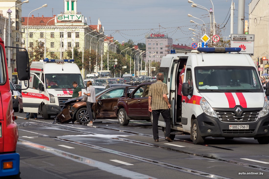 В понедельник ближе к концу рабочего дня на пр. Независимости произошла авария с пострадавшими. Среди участников — две легковушки и один микроавтобус. Последний является маршрутным такси. Возможно, этим фактом объясняется прибытие на место происшествия большого количества машин скорой помощи — не менее пяти. Не обошлось без пострадавших. Движение сильно затруднено.