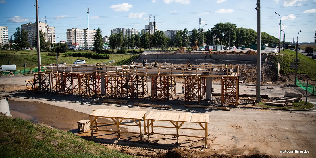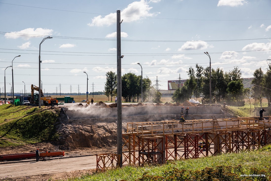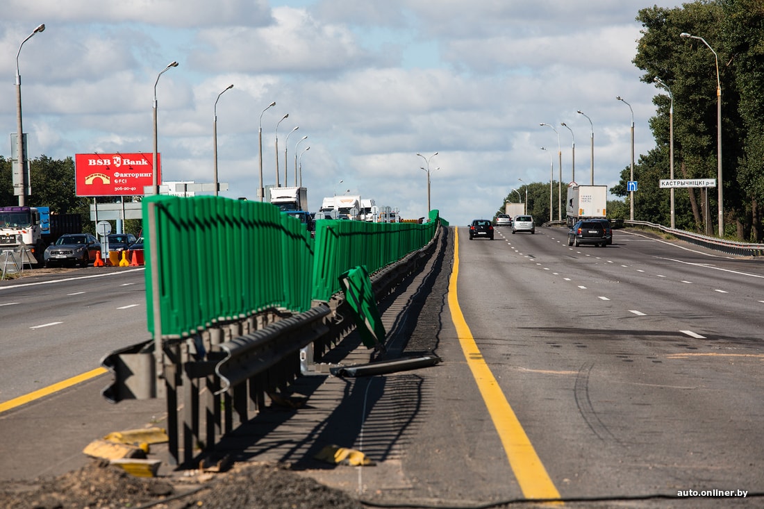 Первого августа стало известно, что путепровод на пересечении Игуменского тракта дал трещину: сломалась одна из балок, проезжая часть заметно просела. Экстренно было остановлено движение по путепроводу на внутреннем кольце. Теперь здесь все совсем по-другому. Минское кольцо сломано, путепровод находится на реконструкции. Конструкция демонтирована, автомобилисты едут через съезды, на месте работает строительная техника.