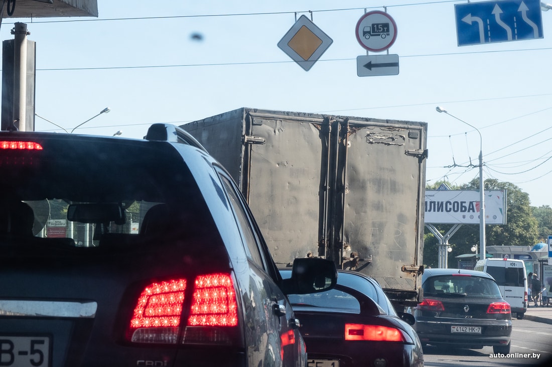По ощущениям, на пр. Победителей после резонансного случая возле ТЦ «Замок» грузовиков стало поменьше. Возможно, это связано с несколькими рейдами ГАИ и в целом с большим вниманием к этой магистрали со стороны правоохранительных органов. Однако все же несколько грузовых автомобилей мы заметили.