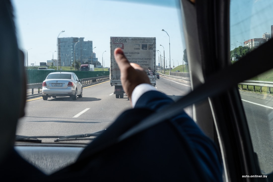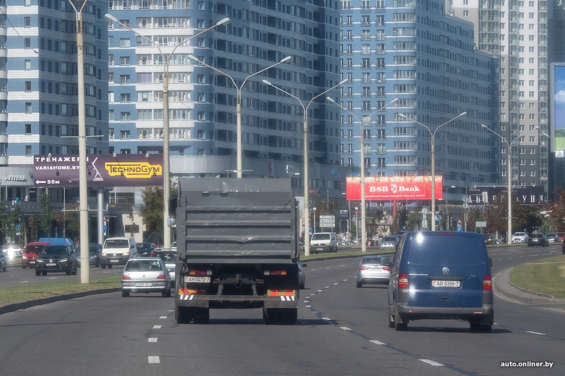 Так, возле «Минск-Арены» замечаем самосвал в третьем (!) ряду. На этом участке проспекта скорость ограничена 80 км/ч. Но грузовик явно движется медленнее. Илья пристраивается за ним и показывает на спидометр: «50 км/ч».