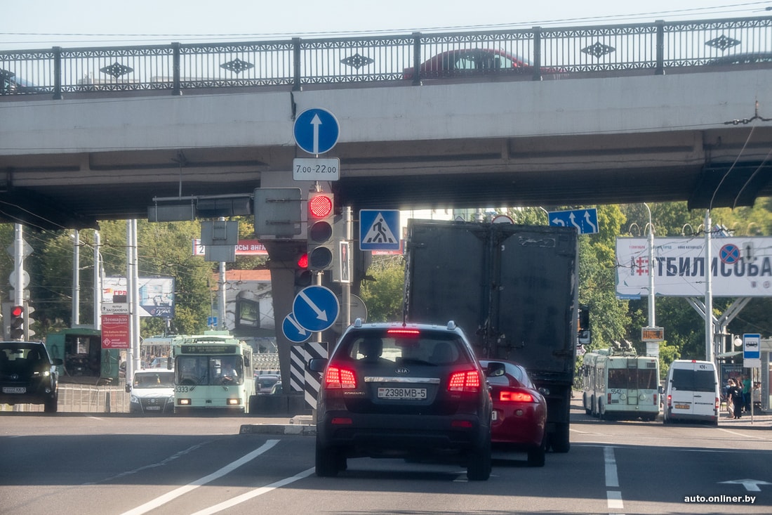 Под путепроводом установлен знак «Движение грузовых автомобилей запрещено» и указана масса 1,5 т. «Автомобили с технически допустимой общей массой более 1,5 тонны, выехавшие на пр. Победителей, могут двигаться, только если они обслуживают предприятия, расположенные на данной территории. При этом они должны въезжать в обозначенную зону и выезжать из нее на ближайшем к месту назначения перекрестке», — так говорят в ГАИ.