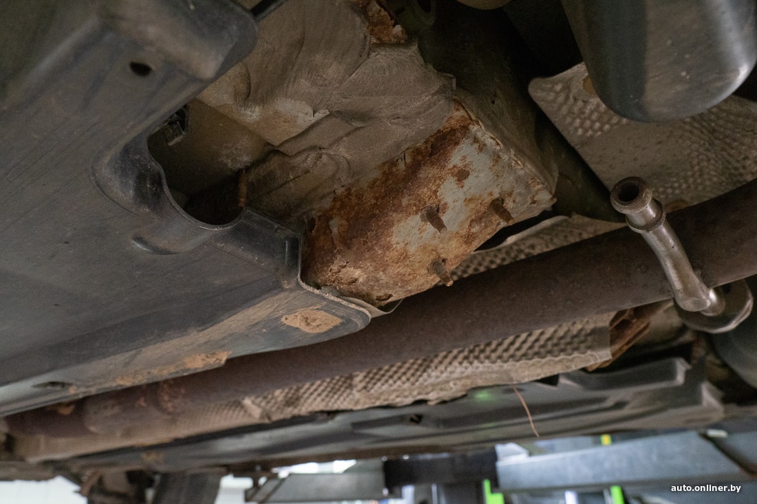 Мастера СТО отметили удар при включении задней передачи АКПП. Посоветовали заменить четыре сайлент-блока на передней подвеске, задний амортизатор слева. Специалисты обнаружили также течь масла коробки передач, запотевание в районе сальника коленвала. Также необходимо проверить кондиционер — судя по всему, он попросту не заправлен. Актуальных ошибок компьютерная диагностика не выявила.
