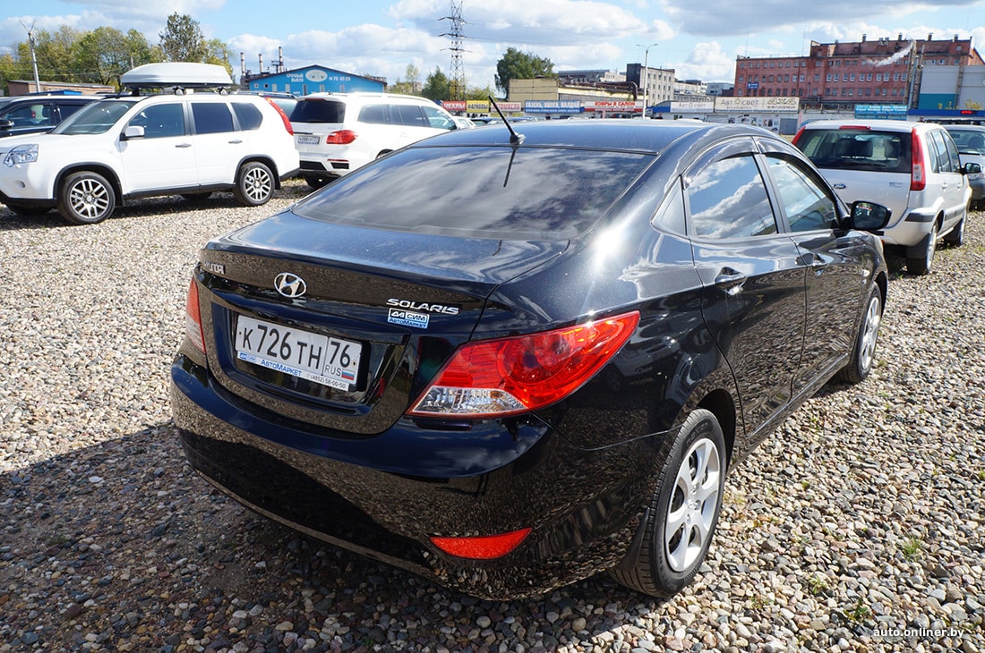 Неужели в Ярославле все «бюджетки»-пятилетки дешевле, чем в родном Минске? Не хочется в это верить. Направляемся к следующему экспонату — черному Hyundai Solaris 2013 г. в. со стандартным мотором объемом 1,6 литра, «автоматом» и неизвестным пробегом. Цена — 521 тыс. российских рублей, что примерно равноценно $7,8 тыс. Рядом с ним стоит та же модель, но 2011 г. в. за 465 тыс. (почти $7 тыс.).