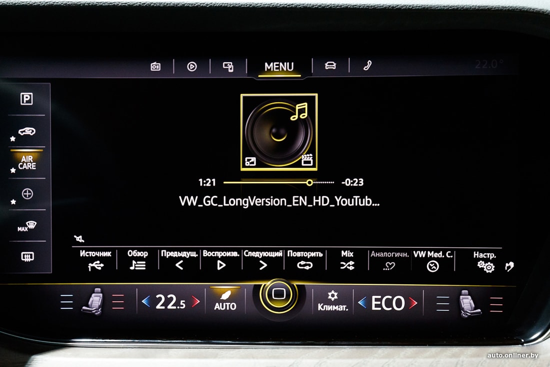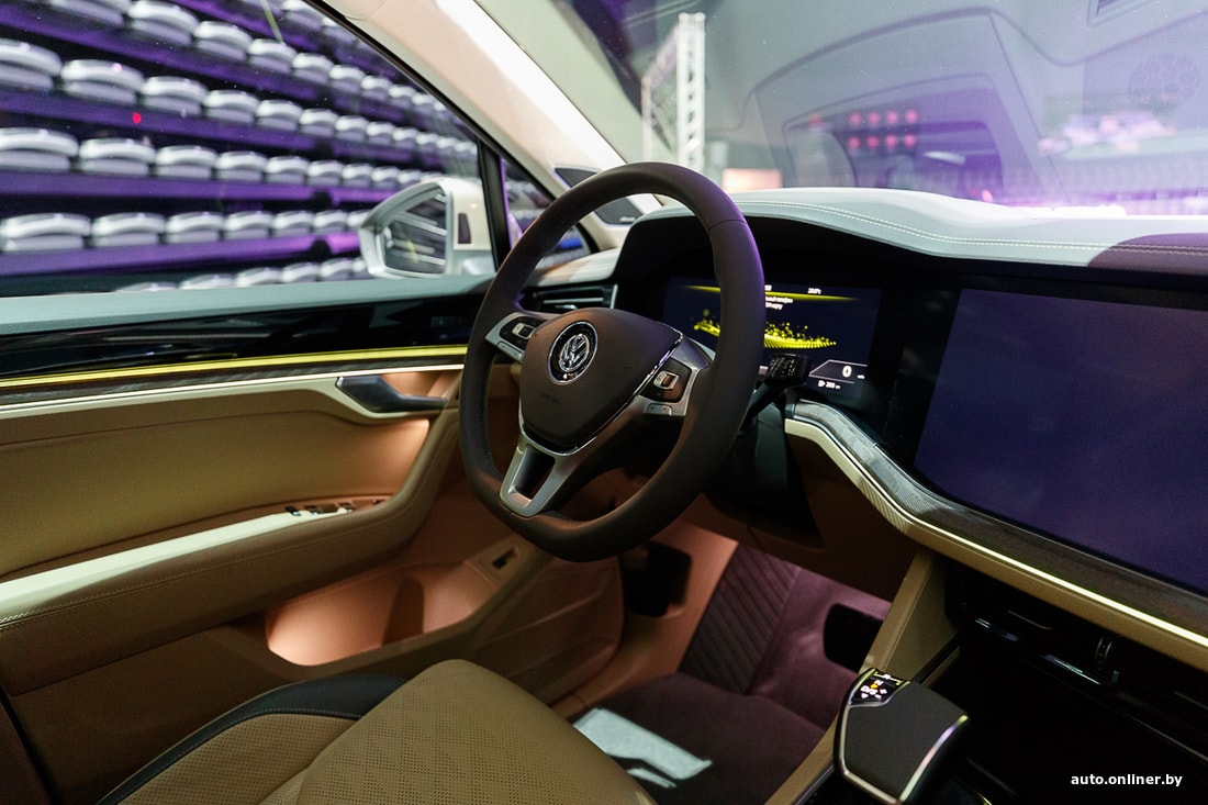 Салон — плод последнего этапа «дигитализации» интерьеров Volkswagen. Центральное место здесь отведено гигантскому 15,3-дюймовому дисплею мультимедийной системы. Правда, нижняя часть этого «телевизора» практически не используется — там постоянно выводится блок управления климат-контролем. Учитывая, что человечество пока не изобрело ничего удобнее физических шайб регулировки температуры, решение «оцифровать» буквально все функции является спорным. Но обещают, что тыкать в монитор можно даже в перчатках. К тому же есть возможность быстрого вывода расширенных настроек климатической системы с четырьмя отдельными зонами. Причем она распознает наличие пассажиров на втором ряду и в случае чего экономит силы на «пустом месте».