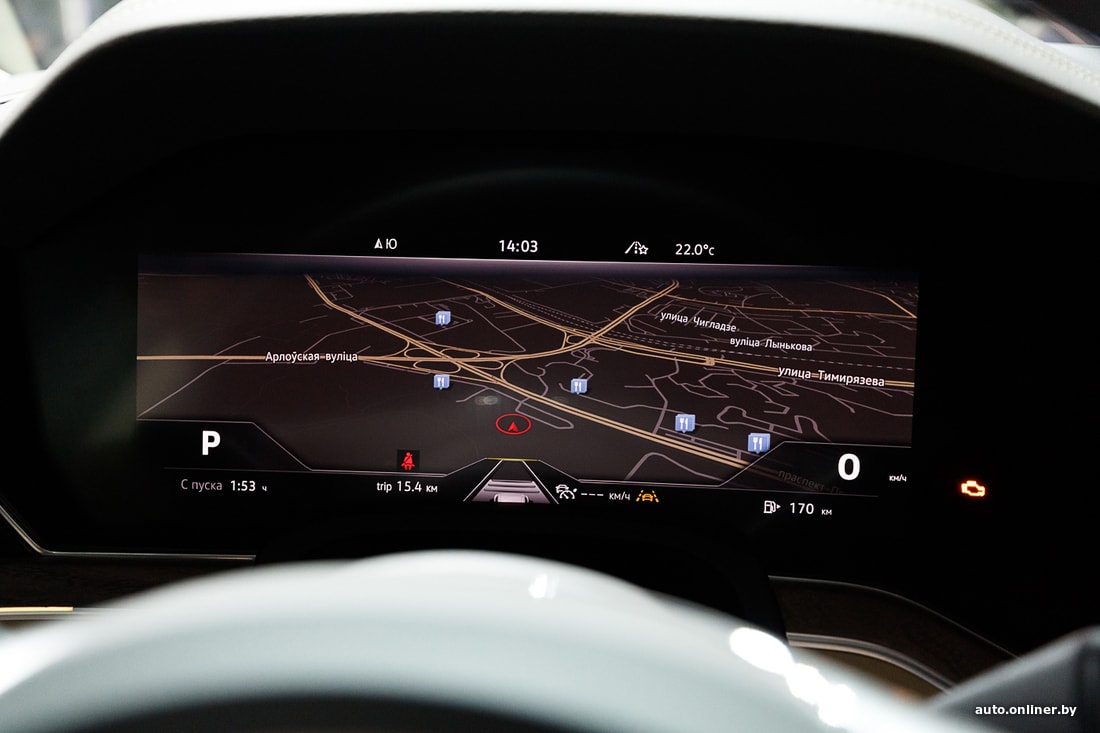 С центральным экраном соседствует полностью цифровая приборка, которая отличается от той, что мы видели на Volkswagen Passat B8 и Volkswagen Tiguan. Имеется head-up-дисплей, который можно покритиковать за мелковатый шрифт и похвалить за полноцветность и широкий угол настройки (даже в горизонтальном направлении). Все эти экраны, само собой, достояние дорогих версий. Экономные клиенты получат аналоговые шкалы спидометра и тахометра и расположенный между ними дисплейчик бортового компьютера. На центральной консоли в базе — 9-дюймовый экран. Так или иначе, система без проблем взаимодействует как с iPhone, так и с телефонами попроще. Кроме того, имеется продвинутая система освещения с 30 различными оттенками и широкой регулировкой яркости.