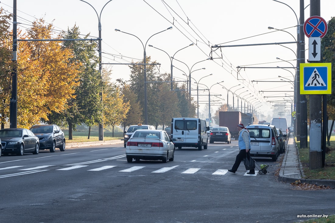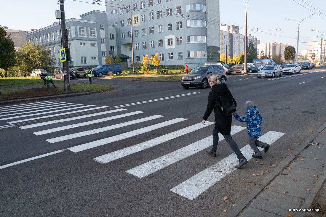 Первое, что бросается в глаза, когда оказываешься на месте происшествия, — «оформление» пешеходного перехода. Он не соответствует стандарту, который за последние годы стал уже привычным для Минска: пониженные бордюры, аккуратные дорожки, местами встречаются даже конструктивные ограждения, препятствующие парковке вблизи «зебры».