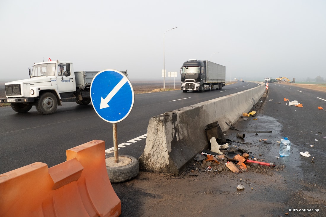 Там и сегодня утром продолжает работу дорожная техника. «В сети сразу стали винить нас, — рассказал один из руководителей строительной организации, находившийся на месте происшествия. — Однако хочу сказать, нарушений с нашей стороны нет. Все средства организации дорожного движения были согласованы с ГАИ и были применены на этом участке. Я вижу проблему в несоблюдении скоростного режима. Появилась информация, что за сутки до ДТП здесь изменилась организация — пару дней назад этот участок проезжали по правой стороне, сейчас — по левой. Это так. Недавно работники выполняли работы по укреплению борта обочины в направлении Минска, Вчера приступили к гродненскому направлению. Потому огородили полосы. Ограждение, еще раз подчеркну, согласовано с ГАИ».