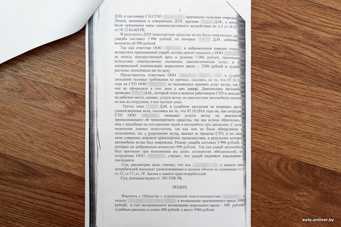 — Как только узнала о произошедшем, выехала на место ДТП, потребовались мои пояснения, — рассказывает собеседница. — А когда освободилась, поняла, что у меня нет никаких документов от СТО. Например, заказ-наряда. Вернулась на станцию, однако директор в выдаче документов отказал. Он продемонстрировал СТБ-1175, о существовании которого я ранее не подозревала.