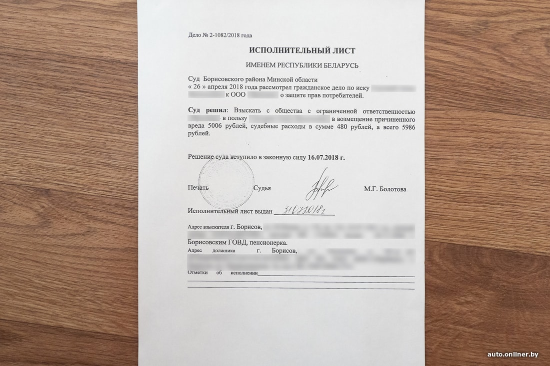 — Директор СТО не согласился с решением, запросил мотивировочную часть, а потом подал кассационную жалобу. Однако решение оставили в силе, — продолжает женщина. — Наконец я получила исполнительный лист и обратилась к судебным исполнителям, так как руководитель станции отказался добровольно оплачивать ущерб. Была произведена опись имущества, и только когда его готовы были вывозить, поступили средства.