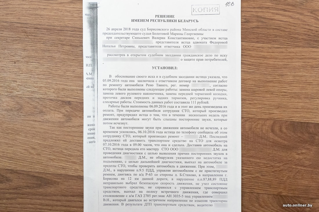 Через год после случившегося хозяйка Twingo начала юридический процесс. Написала заявление в милицию, чтобы выяснить важный момент: так кто диагностировал ее машину — частное лицо или СТО?
