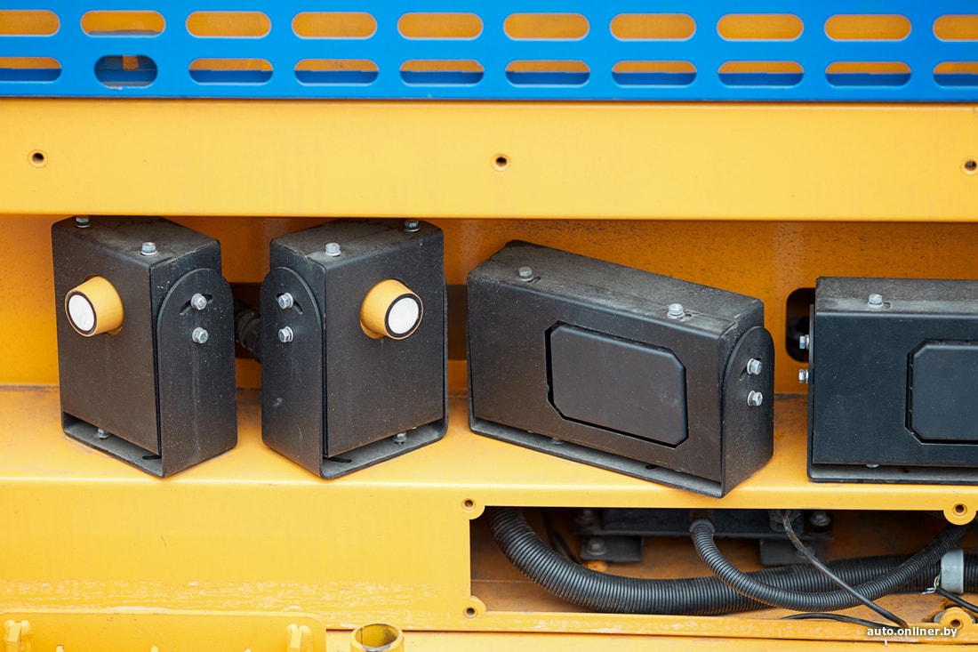 Кроме блока управления, можно обратить внимание на антенны по обе стороны кузова и лидары по бокам. Они анализируют расстояние до объекта и в случае чего останавливают машину. Для внедрения системы автопилота были доработаны рулевое управление, тормоза, гидравлика и система управления тяговым приводом. В стандартные агрегаты встроены небольшие блоки, отвечающие за работу конкретного узла. Все как в легковых автомобилях. Автопилот БелАЗа — это 5-е поколение автопилота по привычной нам классификации. У Tesla, напомним, — 3-е поколение, а до 4-го еще не дошла ни одна серийная легковушка.