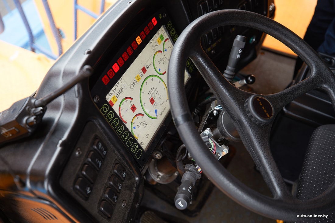 Журналистам показали, как могут взаимодействовать автономные самосвал и погрузчик. На заводском полигоне эти две машины устроили показательный «рабочий вальс» и эффектно перекинули кучу земли из одного места в другое. Самосвал при этом работал в полностью автономном режиме по заданным параметрам, а погрузчиком управлял оператор, сидящий в кабинете неподалеку от полигона. Его рабочее место похоже на игровую консоль с максимальным количеством оборудования — педали, руль, рычаги, три экрана. Но здесь все по-настоящему.