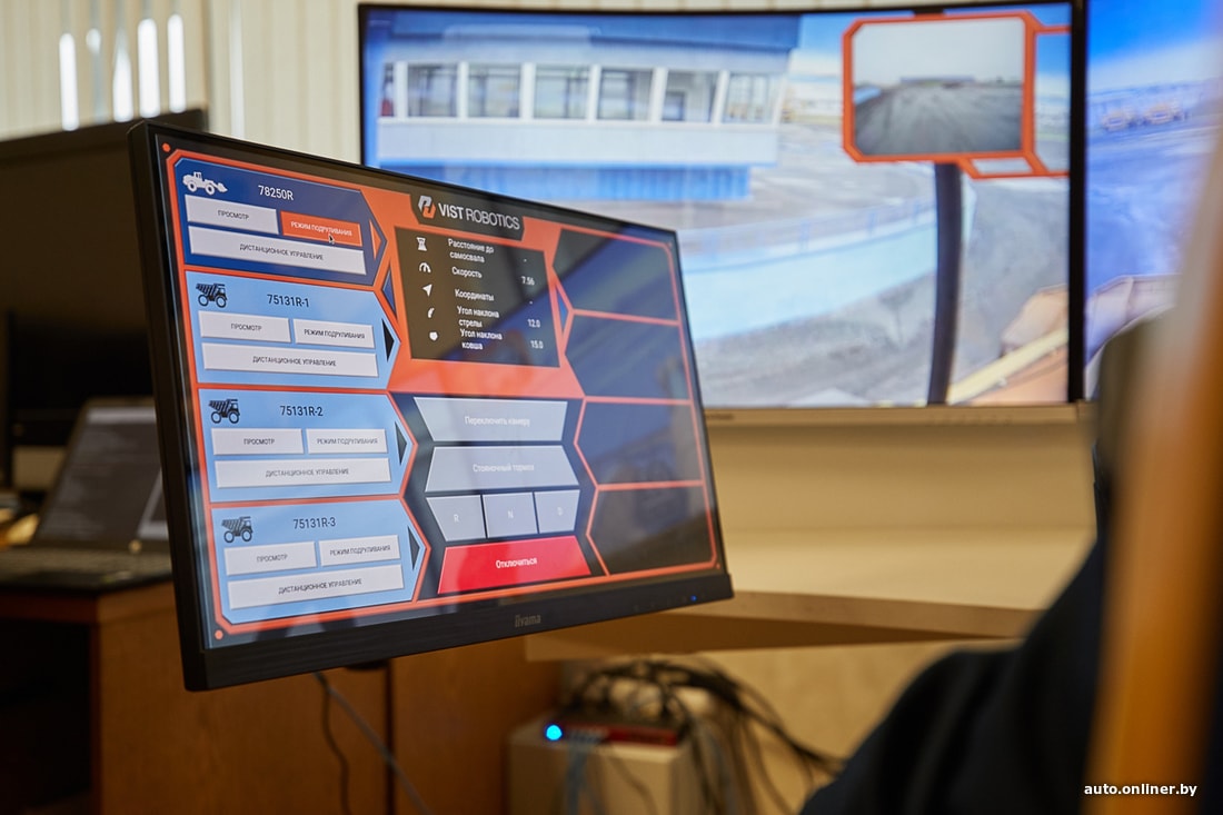 Отклоняясь от темы, хочется отметить, что БелАЗы уже давно пытаются ездить без человека. Еще в 2010 году белорусский производитель представил модель с возможностью дистанционного управления. Конечно, пульт от БелАЗа не такой простой, как, скажем, от игрушечной машинки, но и ничего сложного в нем нет — руль вообще от PlayStation. Управлять многотонным самосвалом приходится с удаленного места оператора. Оно повторяет кабину водителя, но находится далеко от машины. Может быть даже в другой стране — управление происходит через интернет.