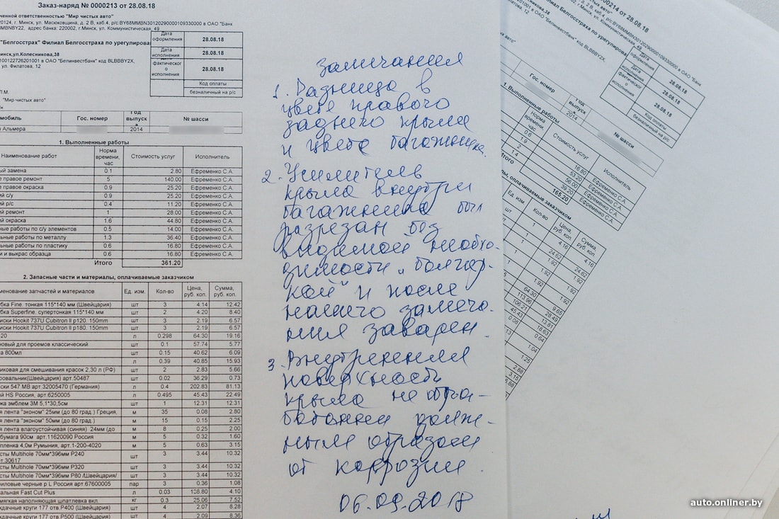 — Руководитель сервиса сообщил, что мы с ним не рассчитались, — утверждает Олег. — На это мы тыкнули в заказ-наряды и указали, что заказчик работ — «Белгосстрах». А между нами никаких финансовых расчетов быть не могло. В итоге сошлись на том, что оставим замечания на заказ-наряде и автомобиль заберем.