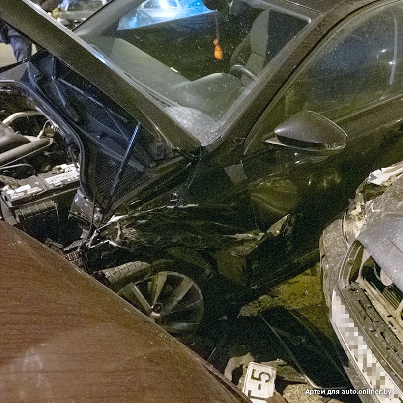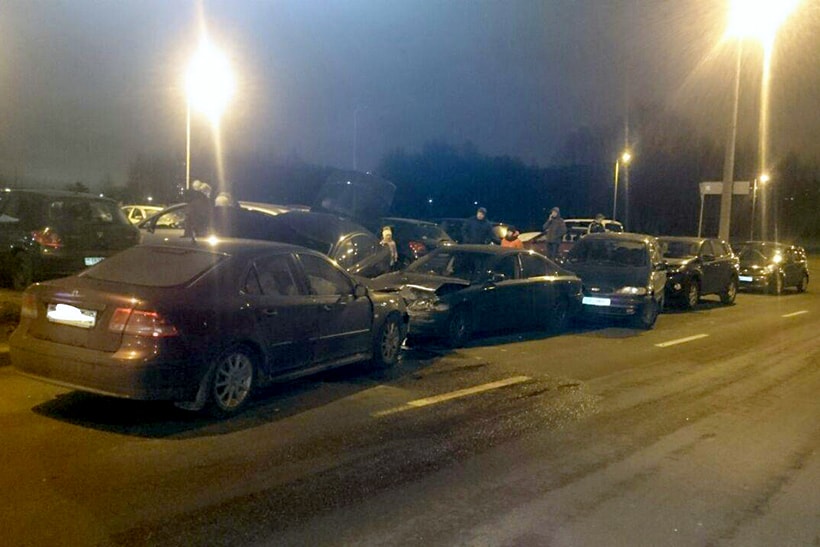 Затем, предположительно, Skoda зацепила Volvo и далее, оказавшись на парковке, врезалась в Honda, которая столкнулась с Volkswagen. Saab также задел Volvo, эту машину отбросило в другой Volkswagen, который попал в Toyota.