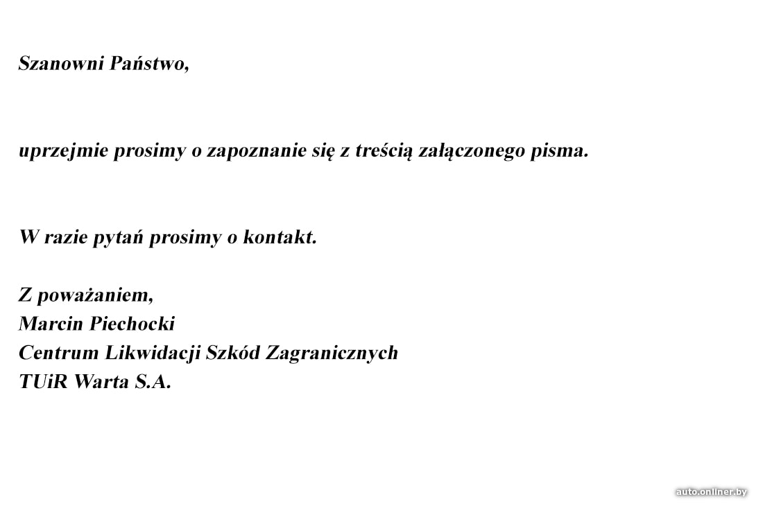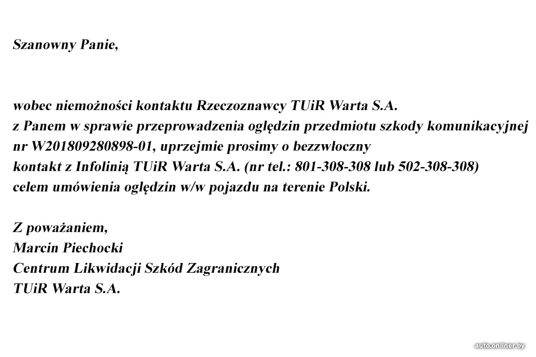 — Видимо, поняв, что я не собираюсь вновь ехать в Польшу, страховщики попросили меня заполнить стандартную анкету, выслать фотографии повреждений, VIN-номера, одометра и пр., — водителя очень выручило знание польского языка. — Также мне необходимо было связаться с варшавским офисом для заполнения еще одного заявления. Не без труда дозвонился до оператора, назвал требуемые данные и стал ждать.