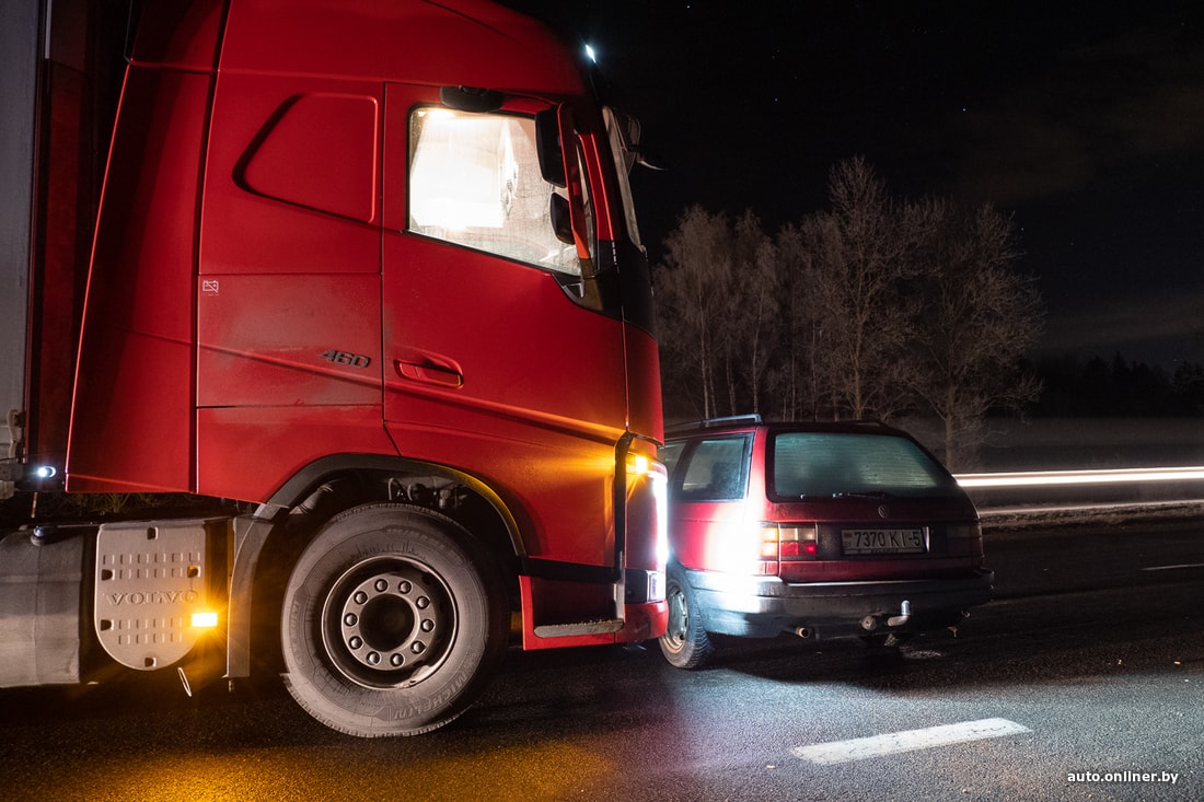 Автопоезд Volvo столкнулся с Volkswagen Passat, в котором находилось несколько человек. Удар был несильным, легковушку развернуло поперек полосы, и грузовик толкал ее перед собой, пока не остановился. Никто не пострадал.