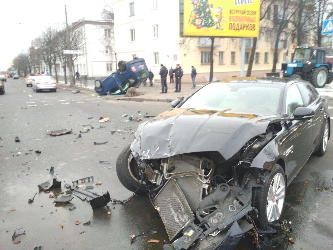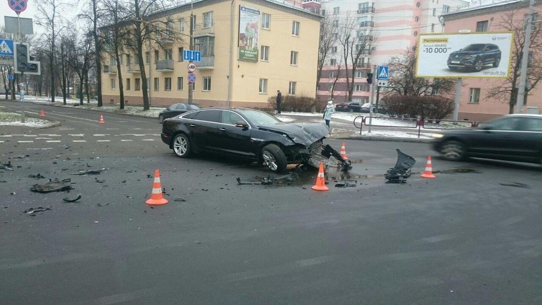В ГАИ уточнили, что водитель Jaguar двигался по ул. Нововиленской со стороны пер. Червякова и столкнулся с движущимся со стороны пр. Победителей по ул. Орловской автомобилем Volkswagen. Последний наехал на бордюр, опрокинулся и врезался в светофор.